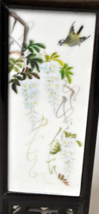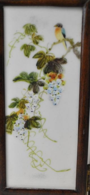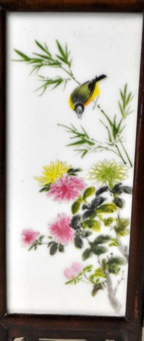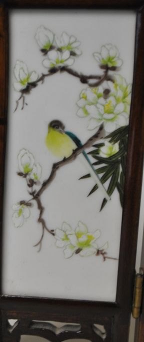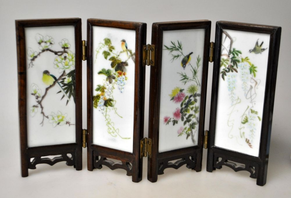 Miniature skærm med håndmalede porcelænsplaquetter, 20. årh. Kina. Skærm af træ. Plaquetter bemalede med forskellige fugle på blomstrende grene. L.: 26 cm. H: 15,5 cm.