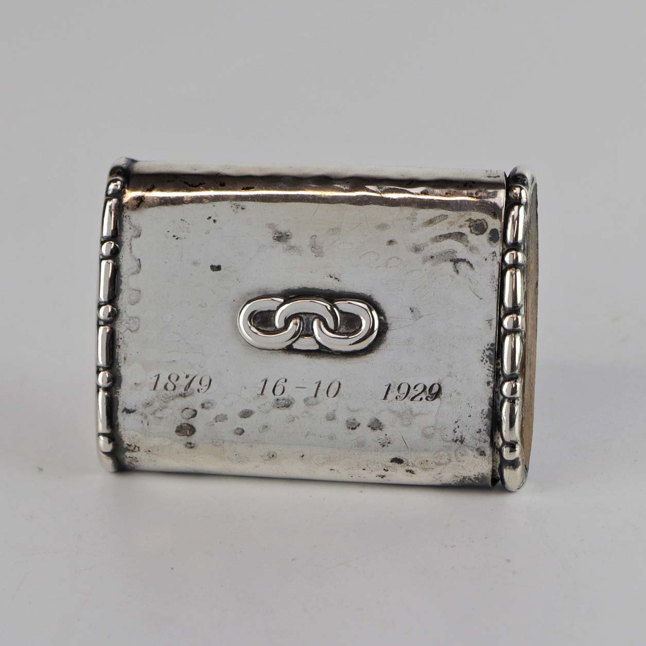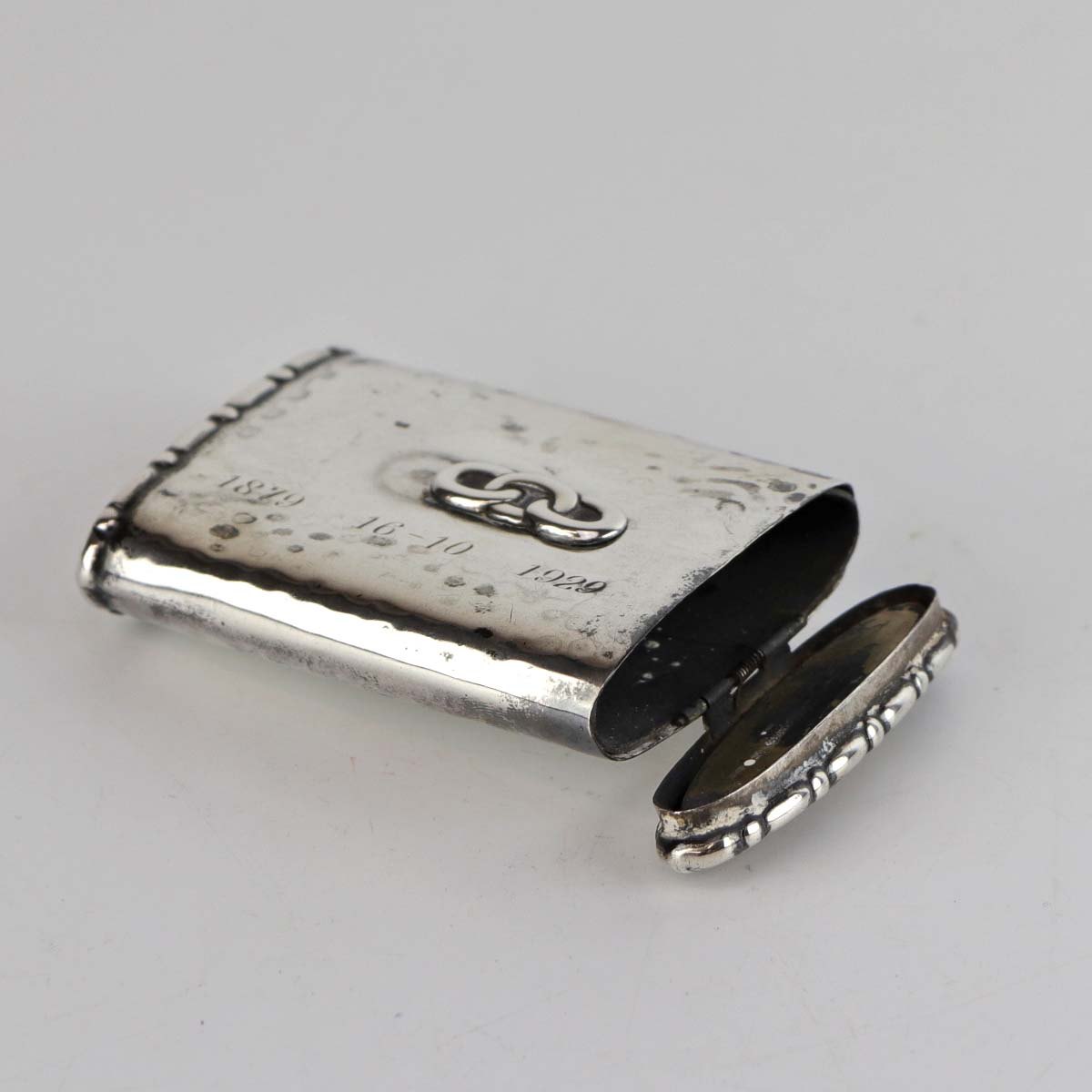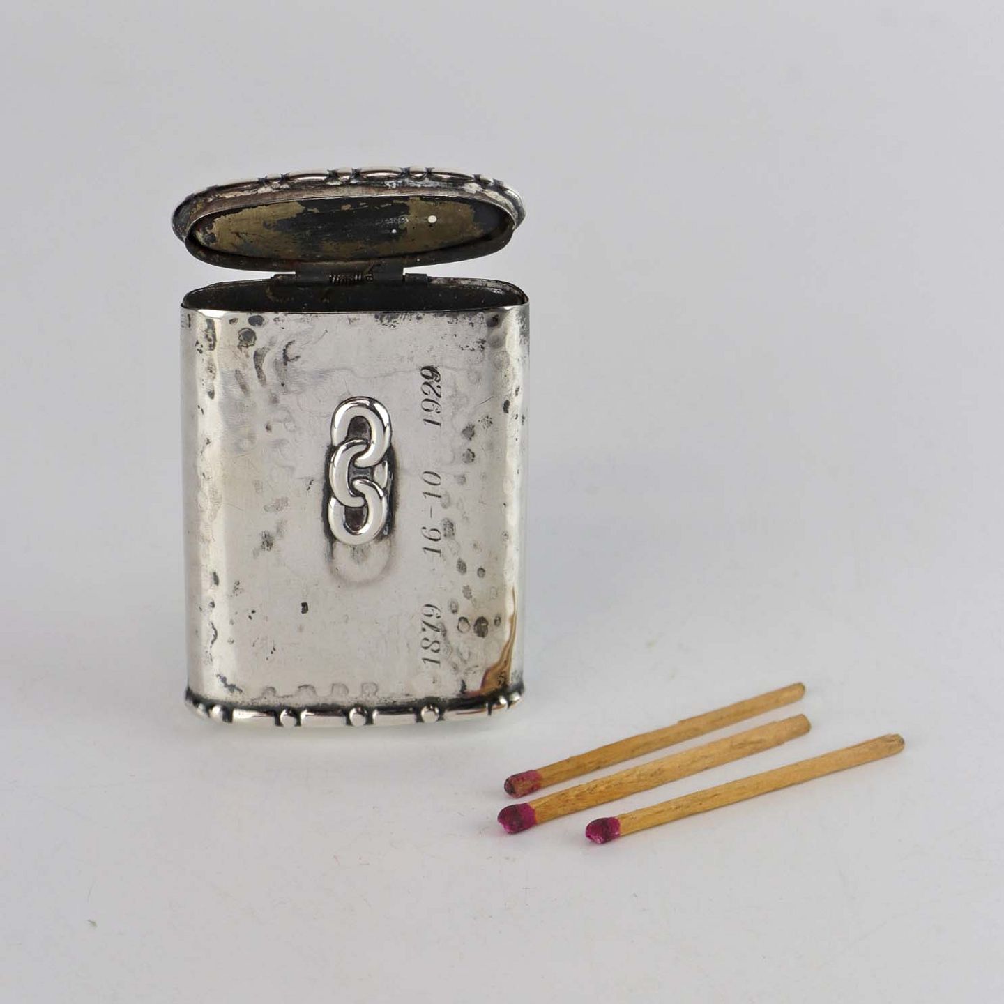 Tændstiksetui i tretåret banket sølv med fjeder åbning og indgraveret skrift 1879 16-10 1929