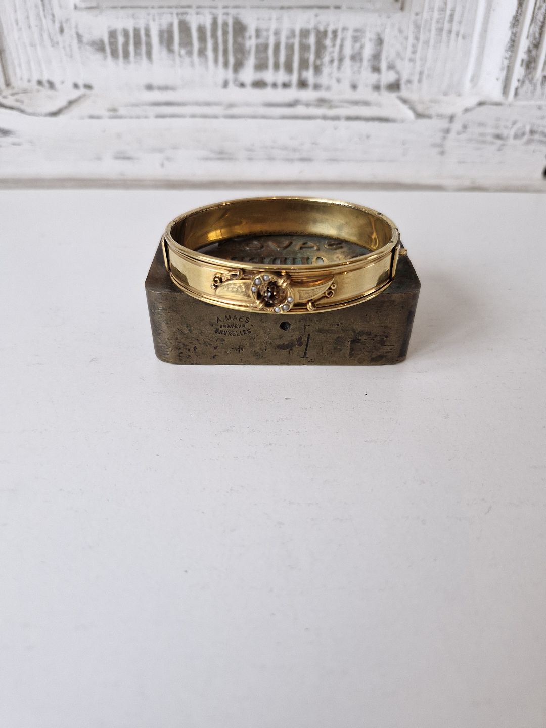Victoriansk armring i forgyldt metal prydet med en granat og små perler