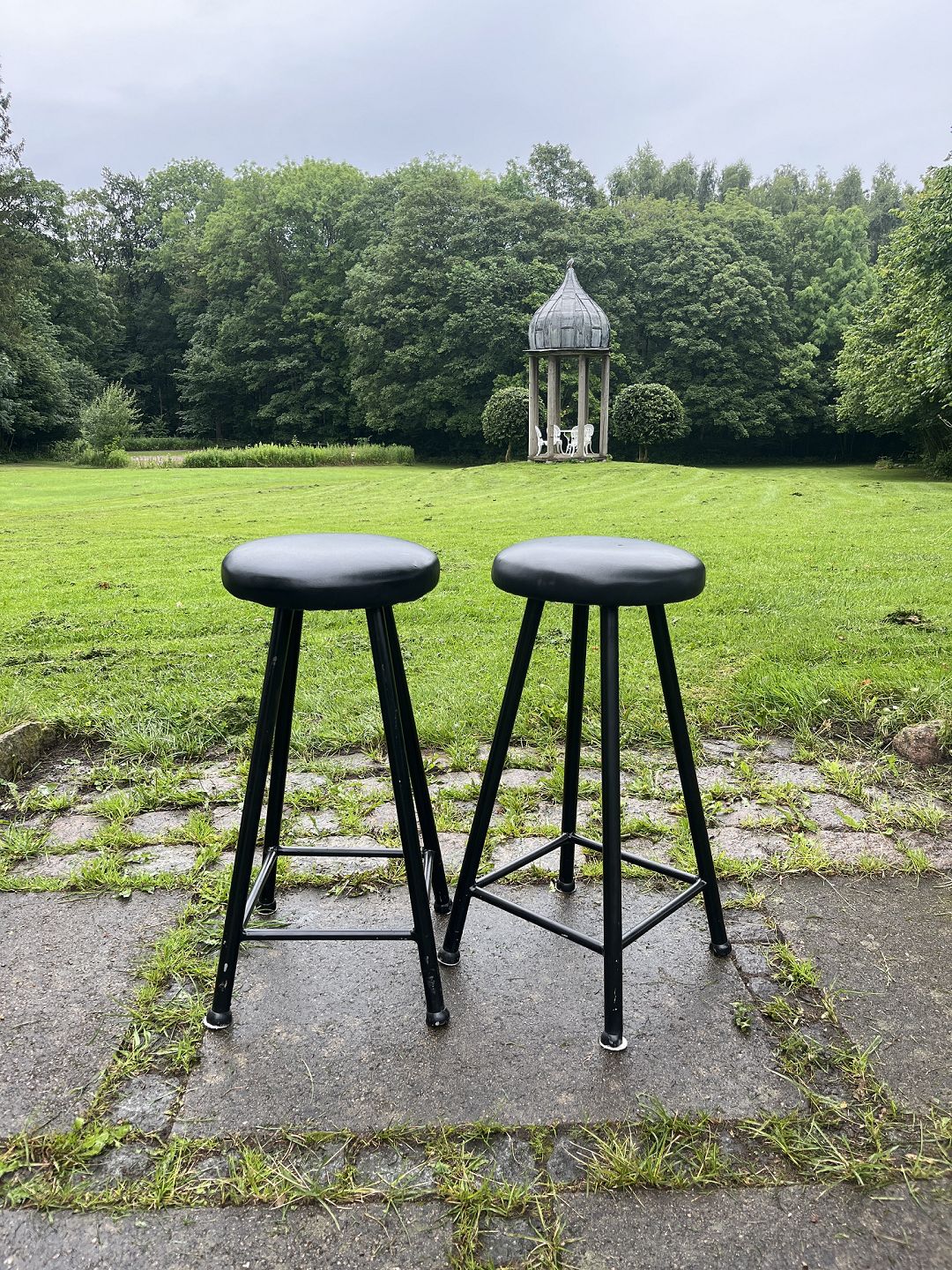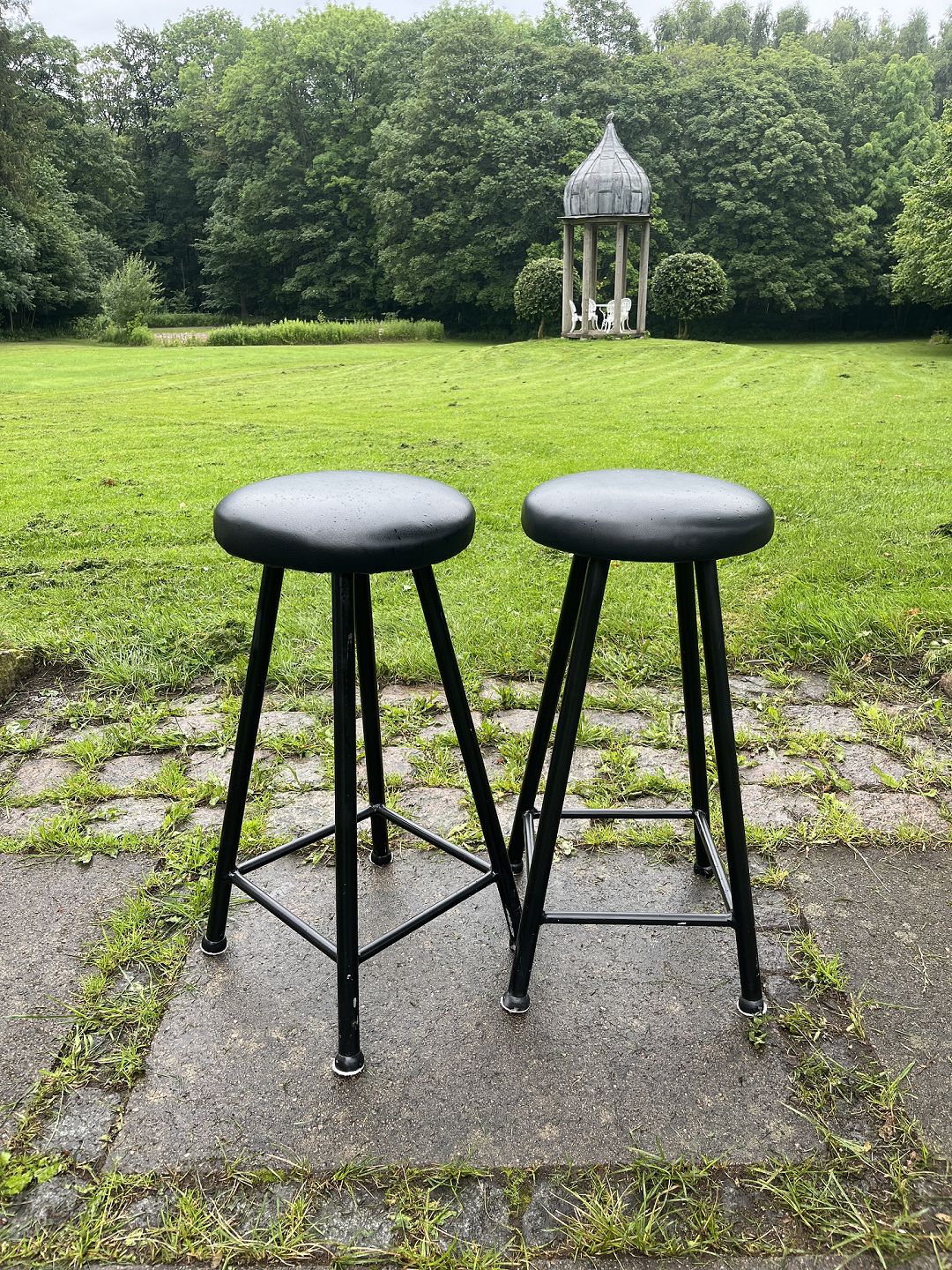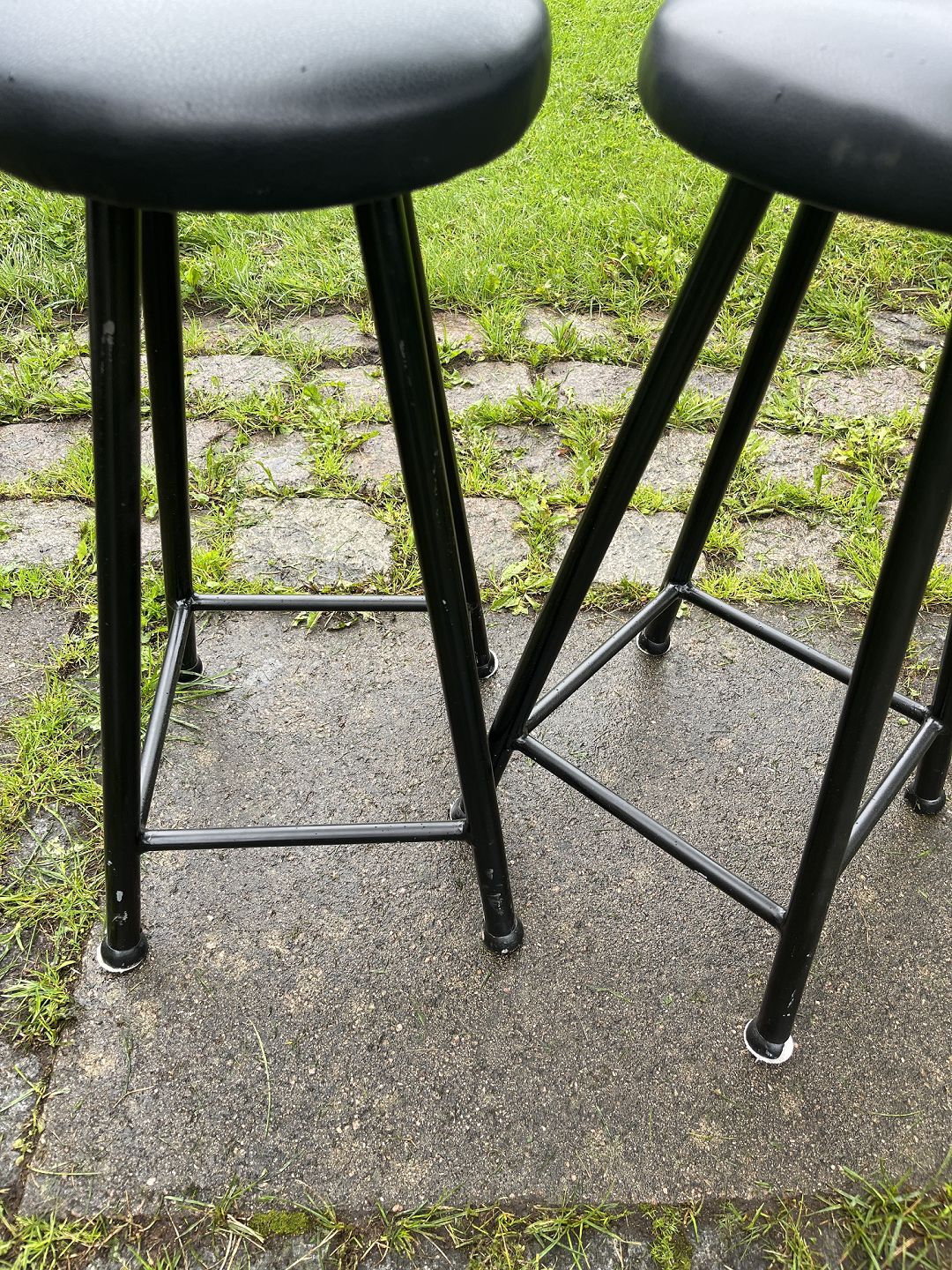 Dansk produceret par barstole m. stel af sortmalet metal samt sæde betrukket med sort læder. Produceret omkring 1980'erne. Pæn stand.