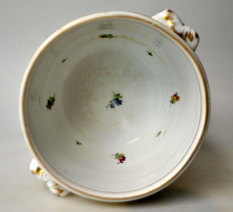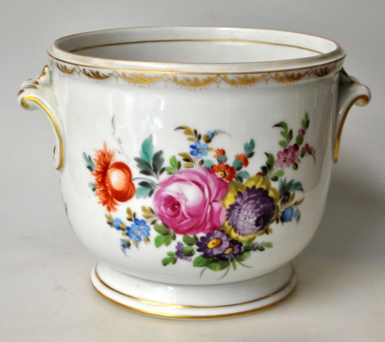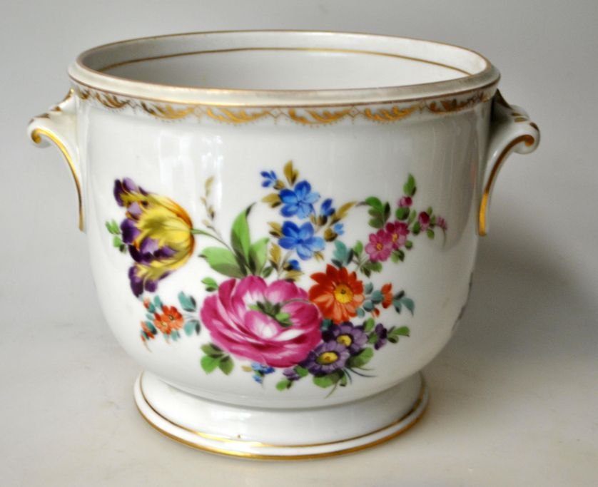 German hand-painted flower pot, 20th century. Hand-painted decorations with flowers. With two handles. With gilding. Inside decorated with scattered flowers. Stamped. H.: 14.5 cm. Dia.: 16 cm.