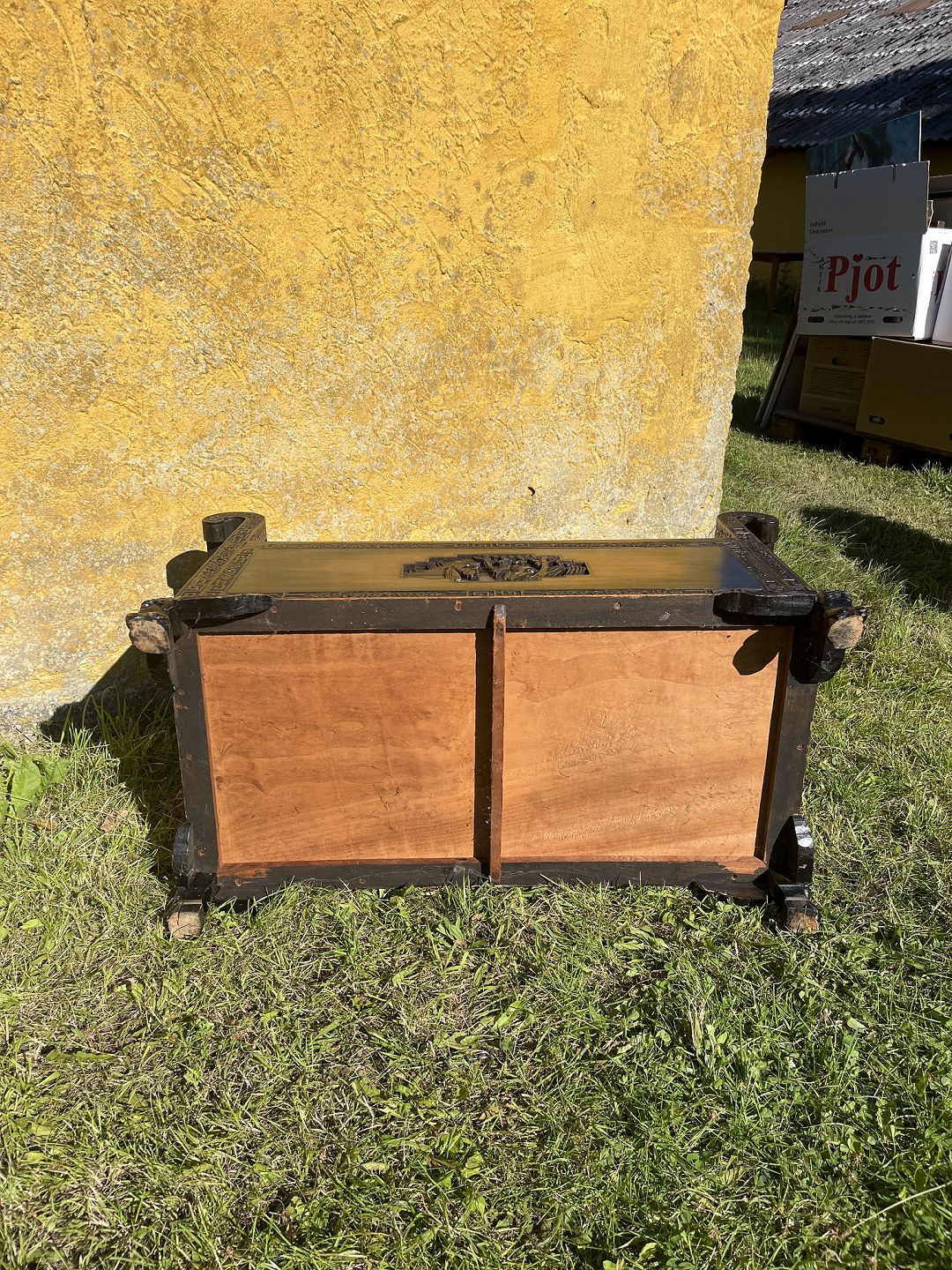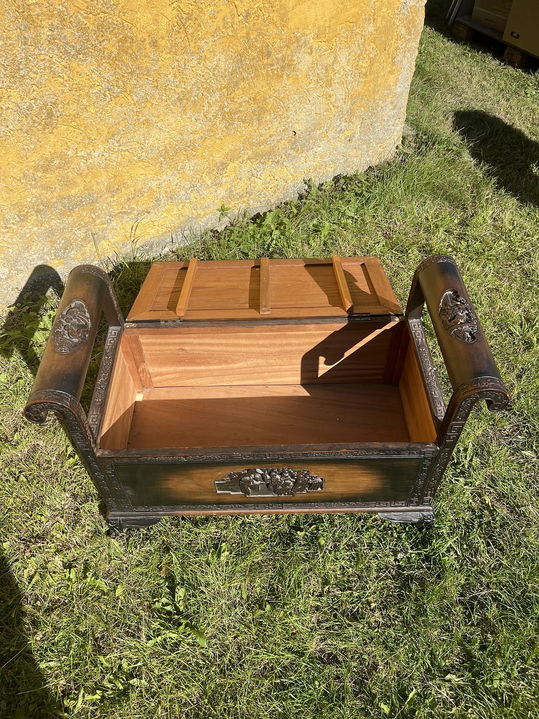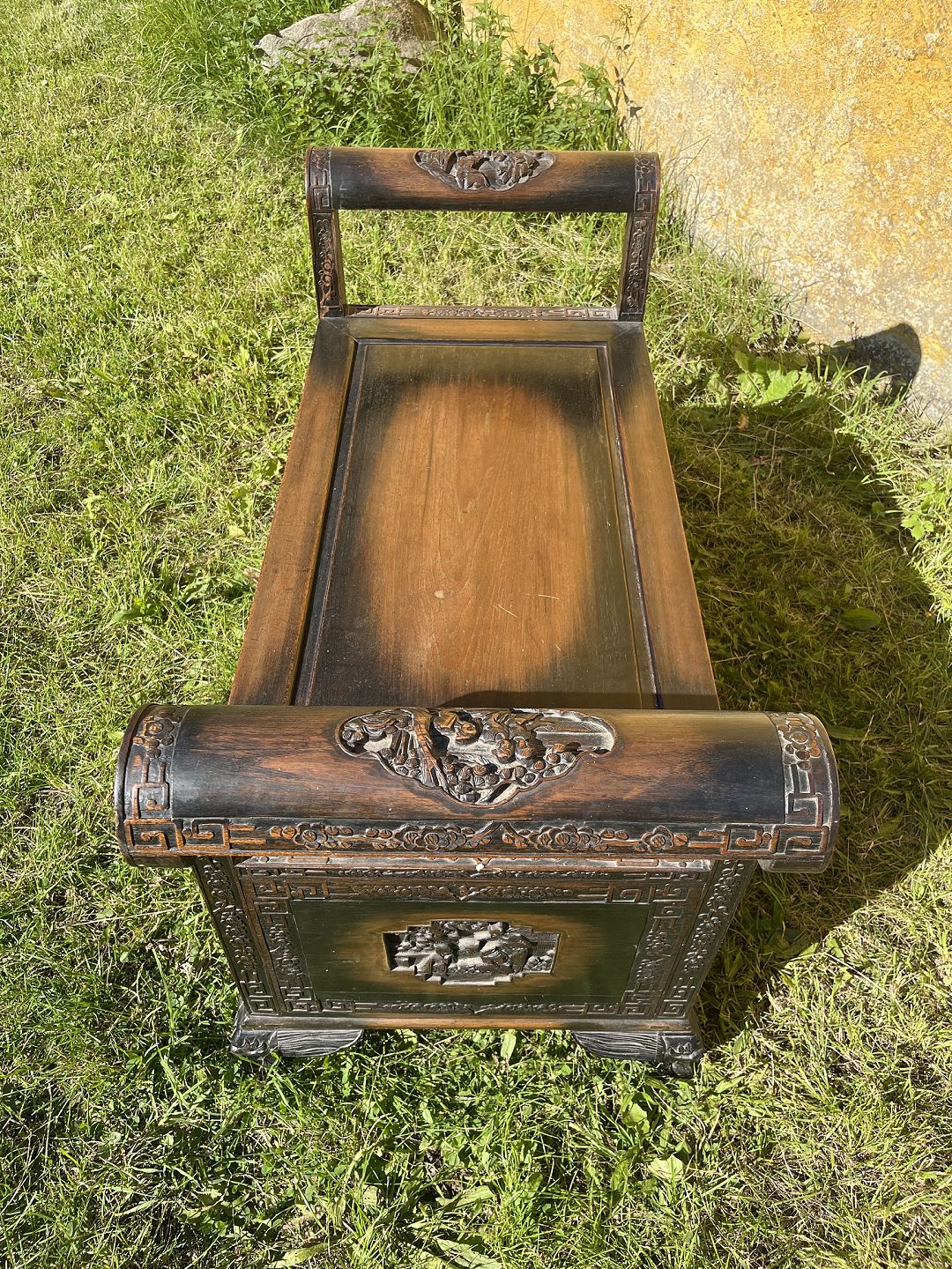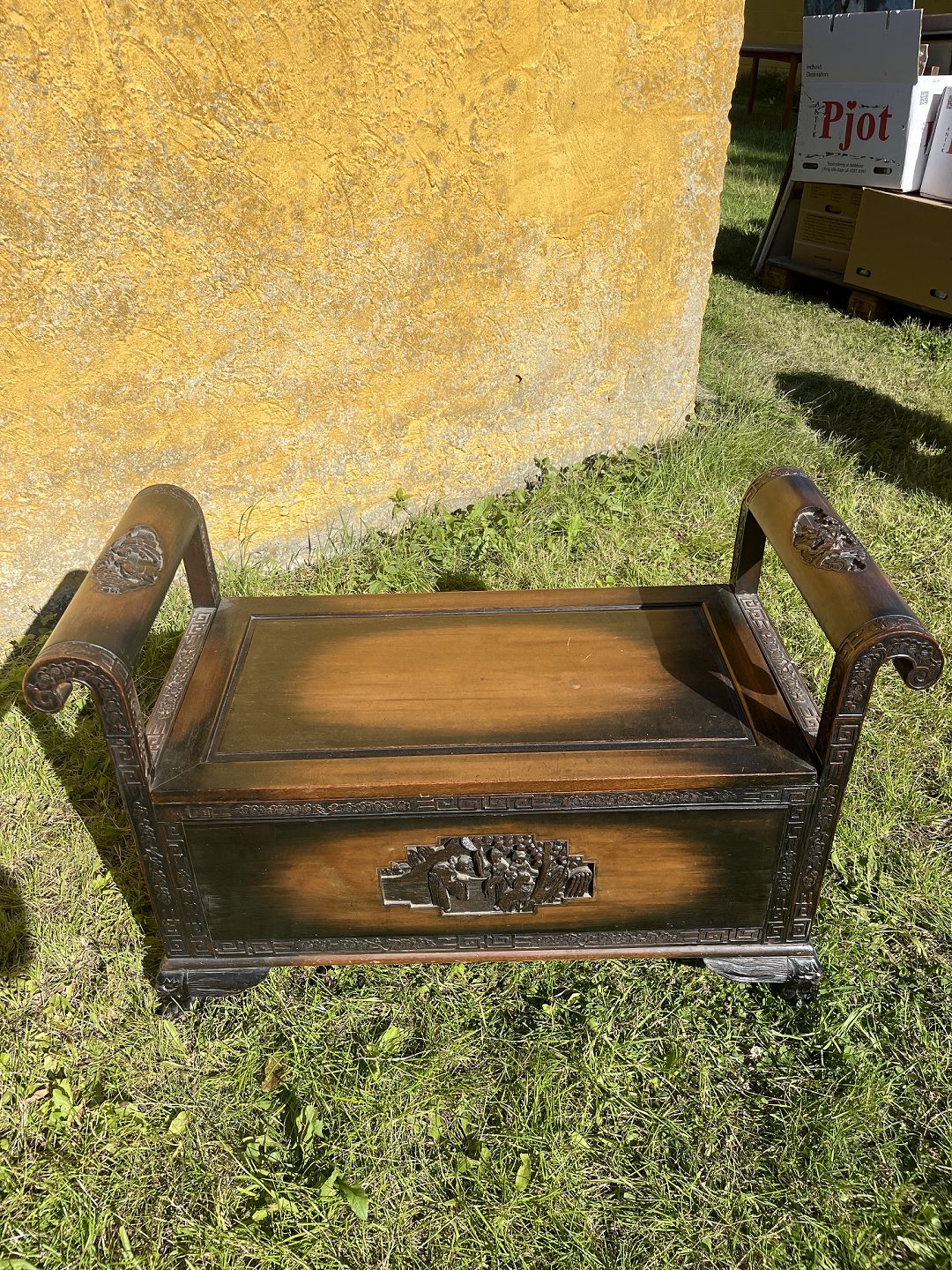 Slagbænk med orientalske udskæringer i massiv egetræ.