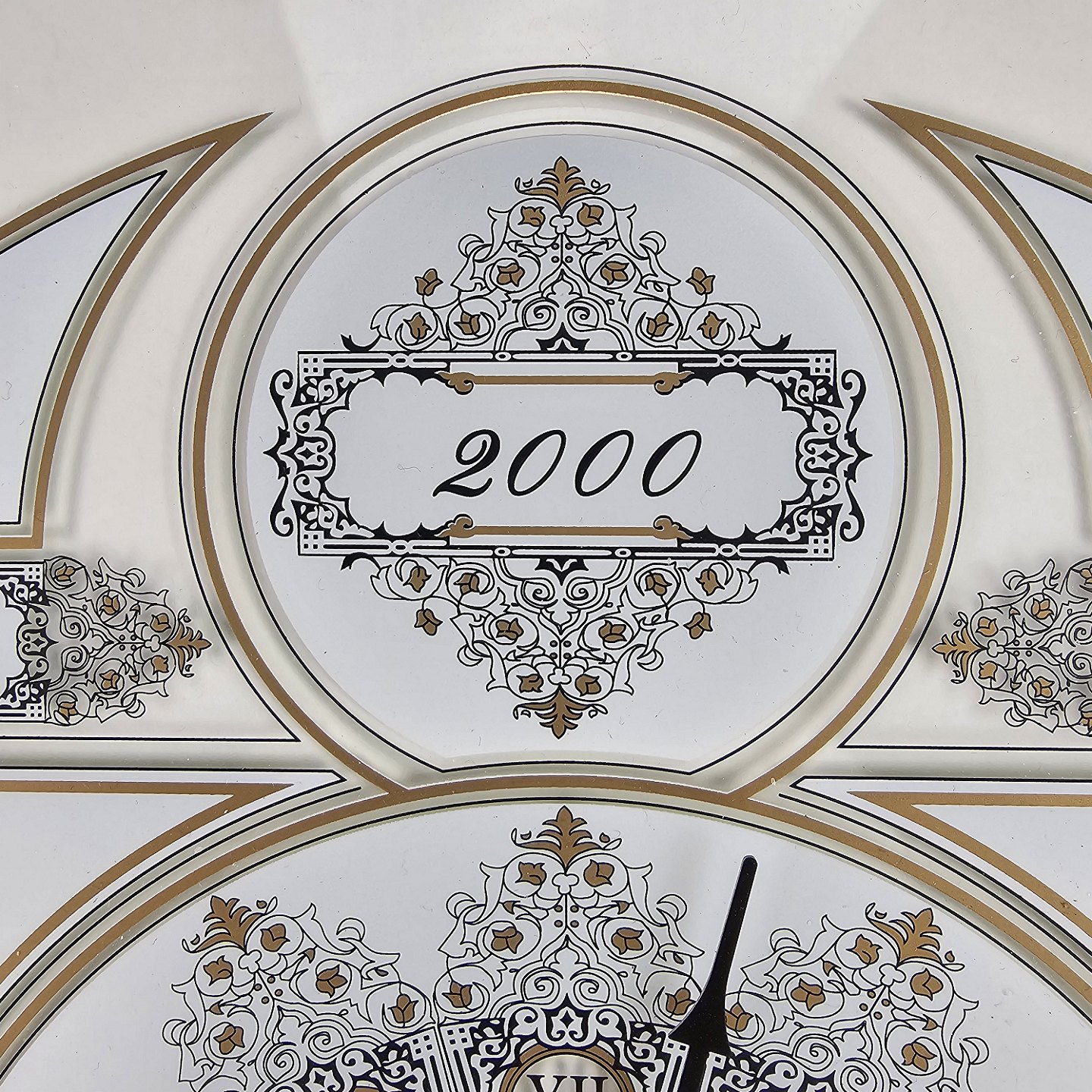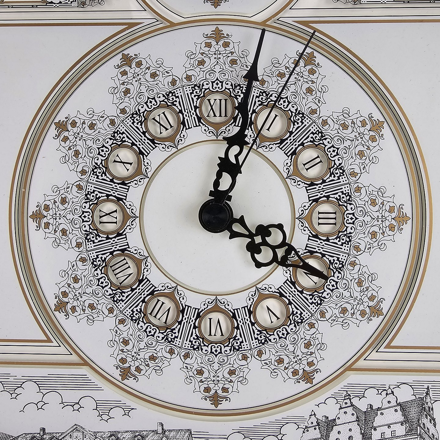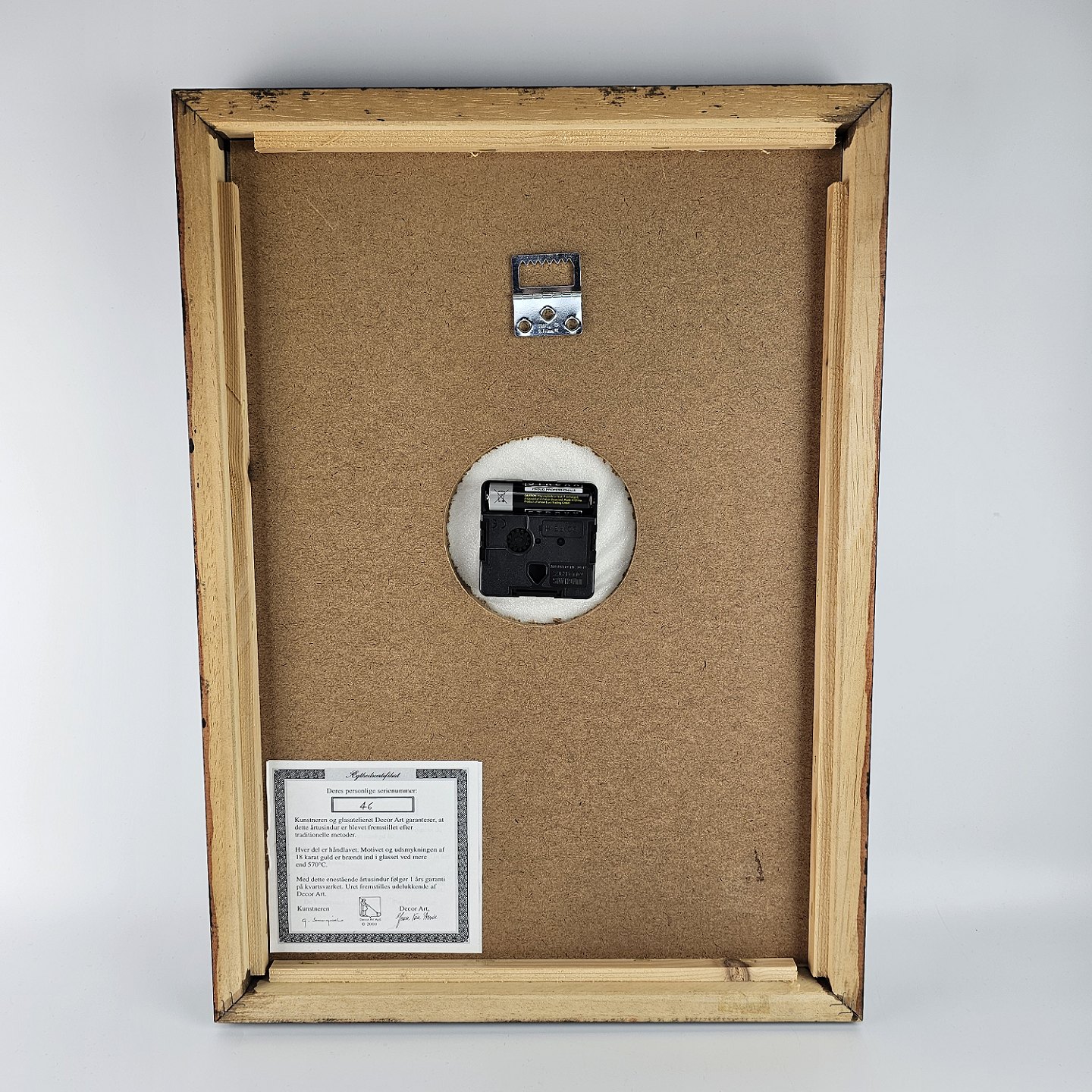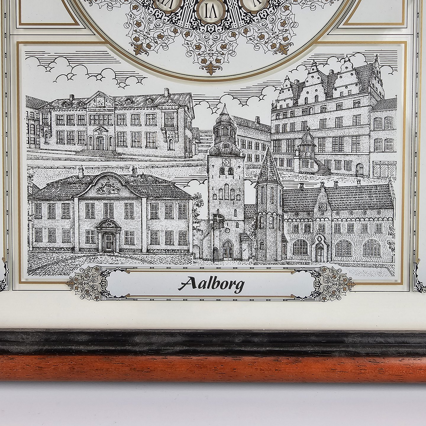 Millenniums Ur i mahonie ramme med motiver fra Aalborg på glaspladen. Der er dekoreret med 18 kt guld. Det går fint på batteri.