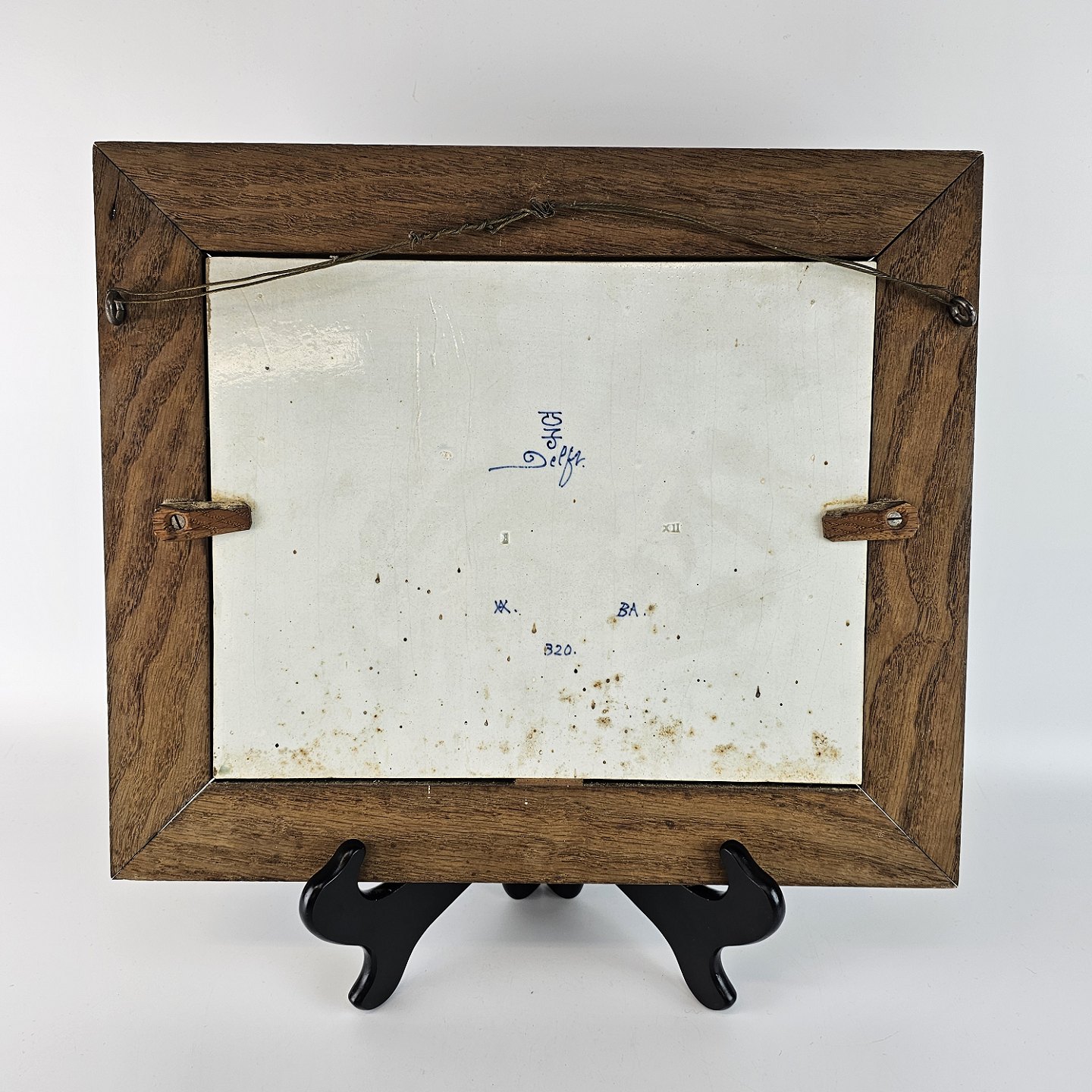 Maleri på flise af fajance i ramme. Fra 1931. Motiv af vandkant, mølle og flodpramme