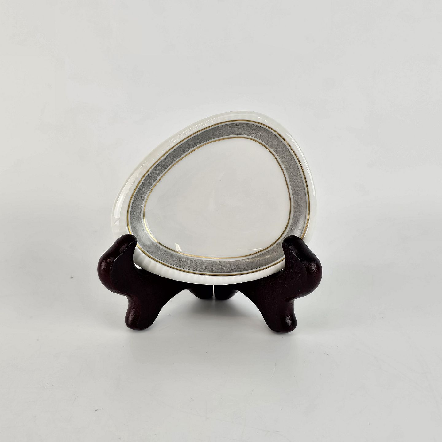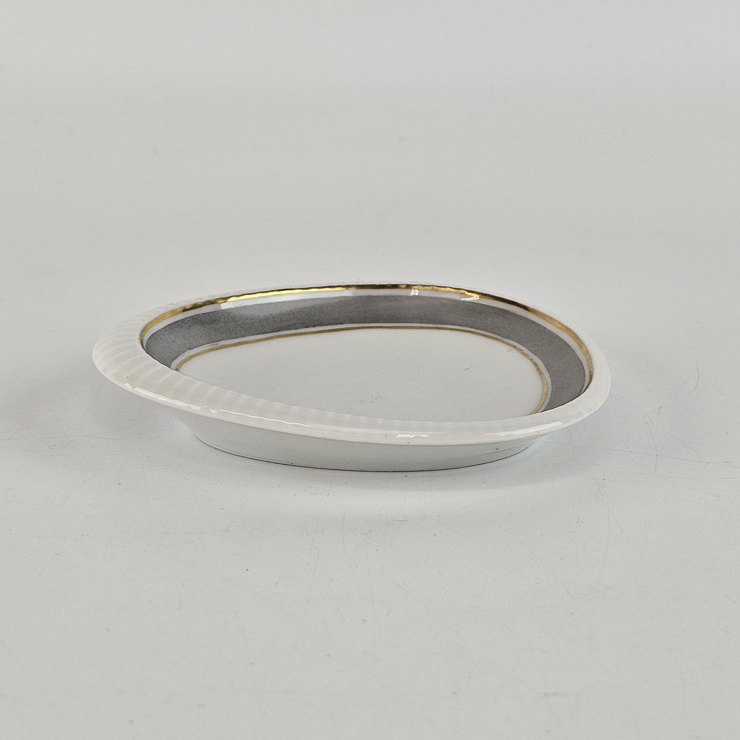 Norma er hvidt porcelæn dekoreret med gråligt bånd og guldringe. Brugsspor kan forekomme