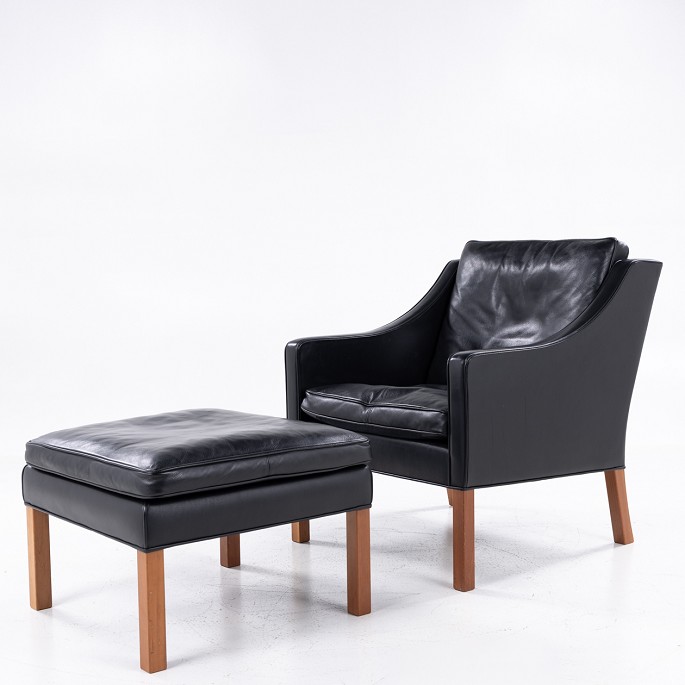 BM 2207 - Lounge chair in original black leather incl. footstool with light walnut feet.