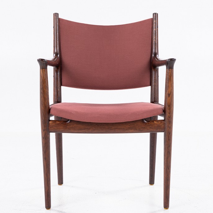 JH 713 - Armstol i mørkbejdset eg og originalt, rødt tekstil.