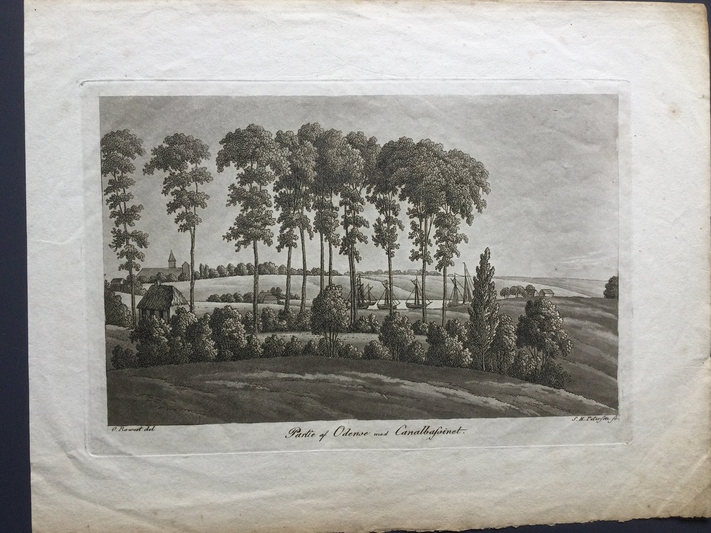 Kobberstik af Søren Henrik Petersen - Parti fra Odense, Kanalbassinet ved Tolderlund 1819.