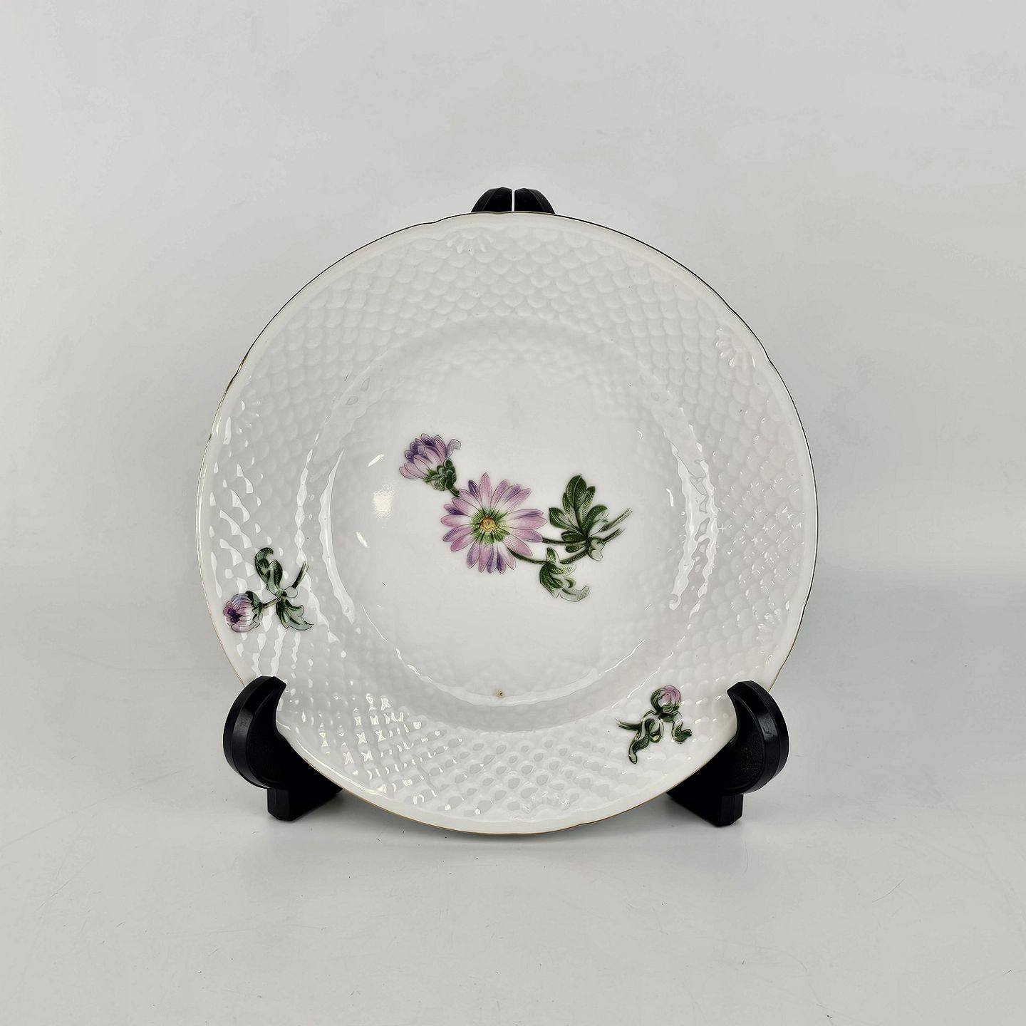 Stellet Krysantemum er af hvidt porcelæn, dekoreret med lys lilla blomst, grønne blade og guldfarvet streger
