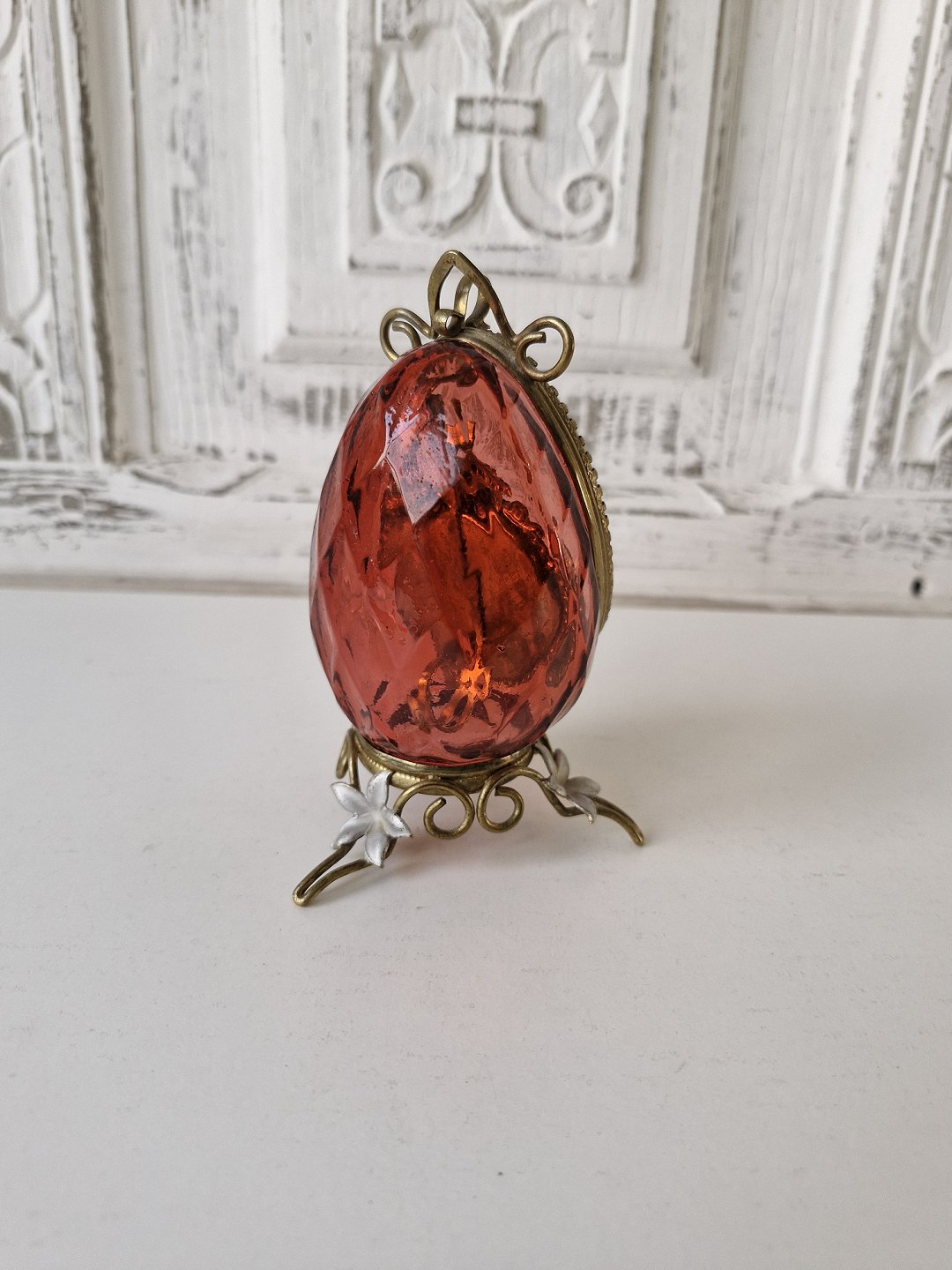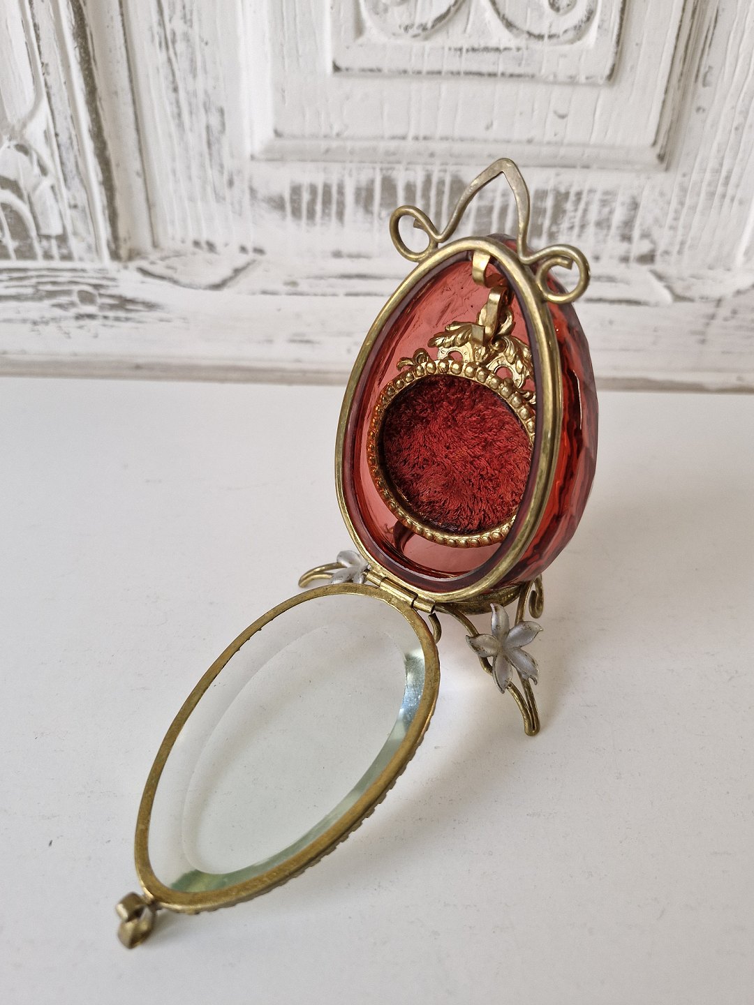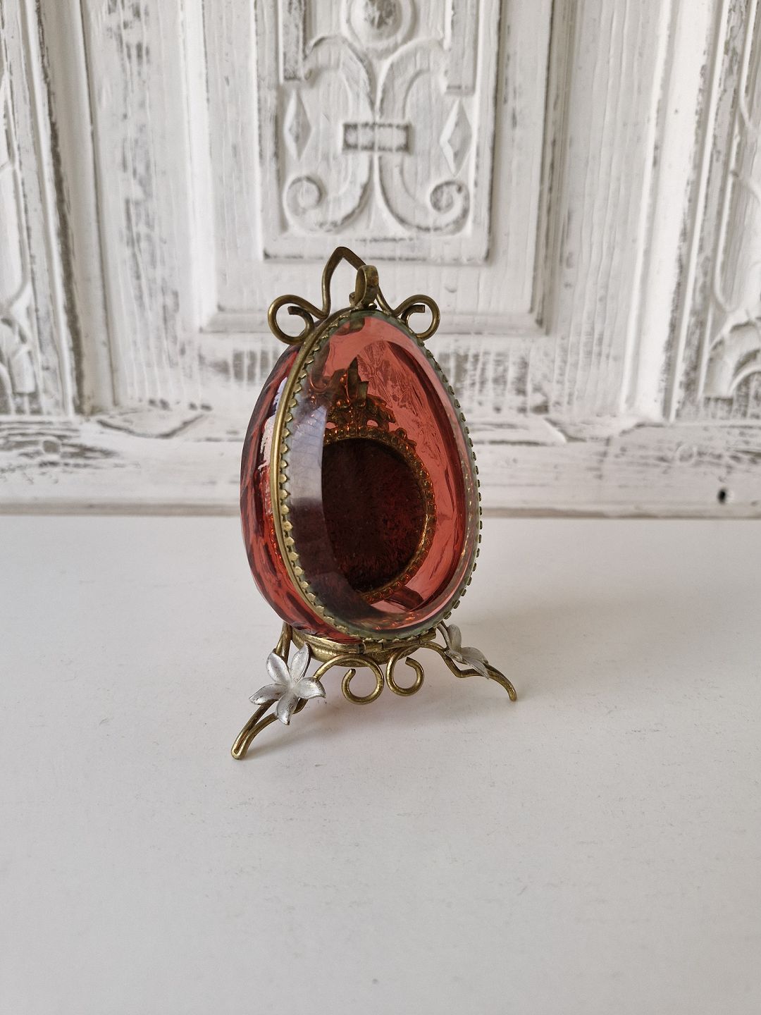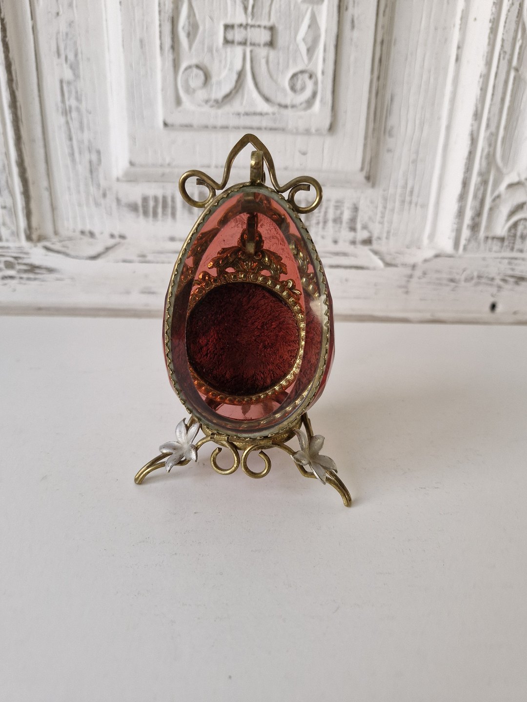 Art Nouveau ægformet ur skrin i hindbærfarvet glas med forgyldt montering