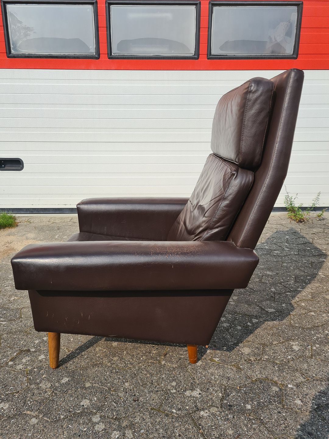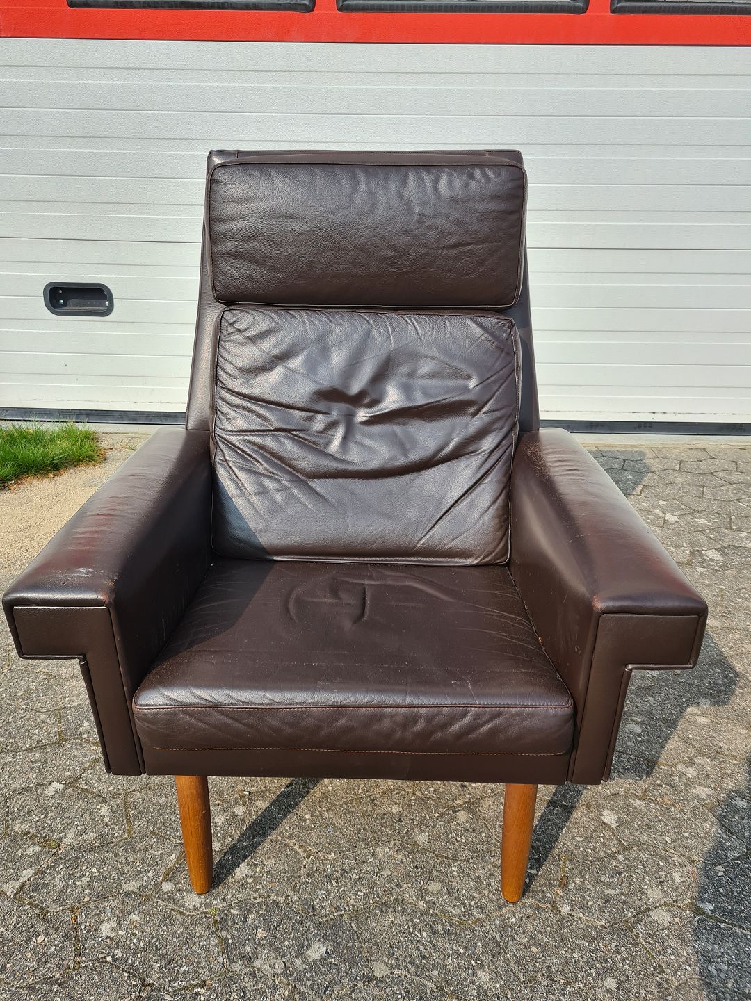 Lænestol i læder med ben i teaktræ, fra 1960erne.