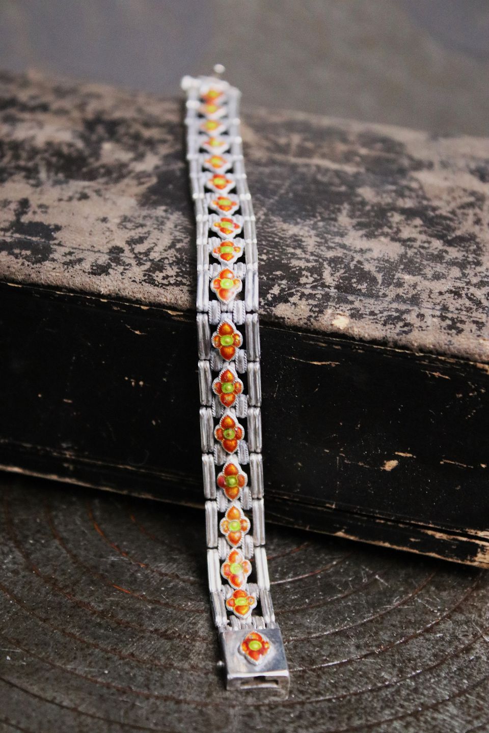 Gammelt sølv armbånd med indlagte emalje blomster i orange farve. Længde 18cm. 25,8 gram. Stemplet 925S.