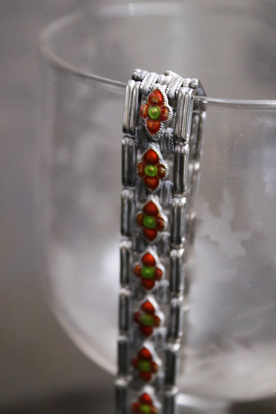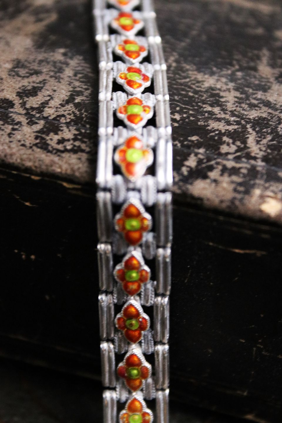 Gammelt sølv armbånd med indlagte emalje blomster i orange farve. Længde 18cm...