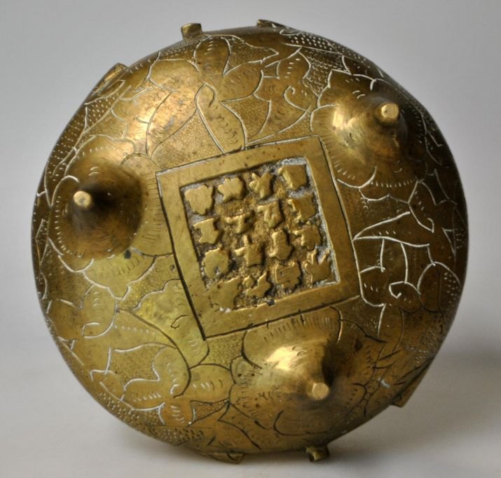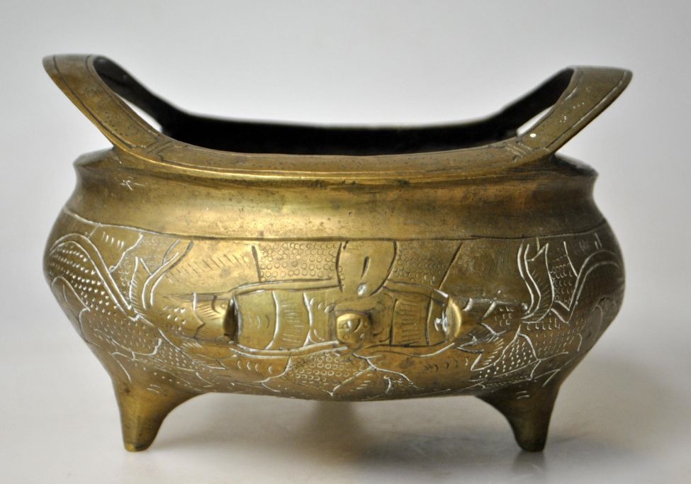 Kinesisk røgelseskar i bronze, 20. årh. Med tre ben og to hanke. Med dekorationer på sider og top. Stemplet. H.: 10 cm. Dia.: 15,5 cm.