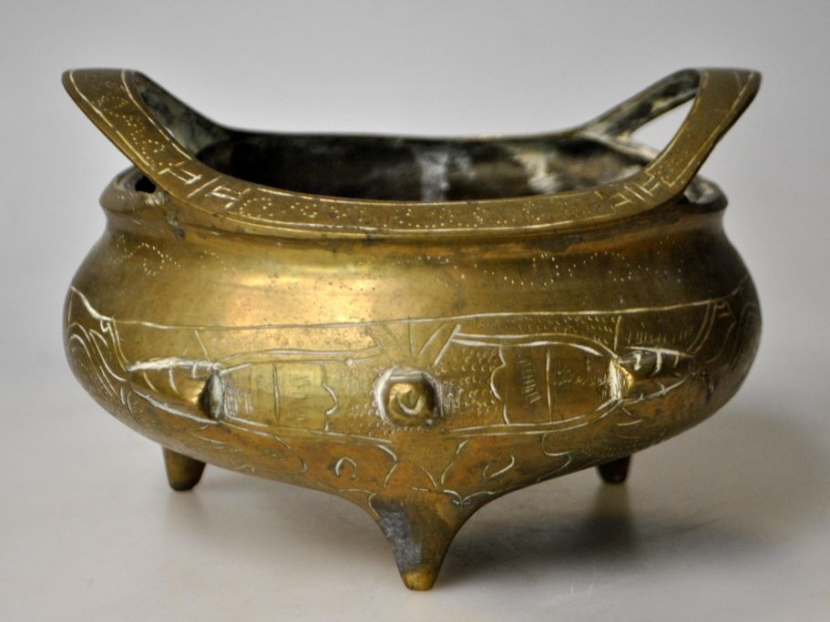 Kinesisk røgelseskar i bronze, 20. årh. Med tre ben og to hanke. Med dekorationer på sider og top. Stemplet. H.: 10 cm. Dia.: 15,5 cm.