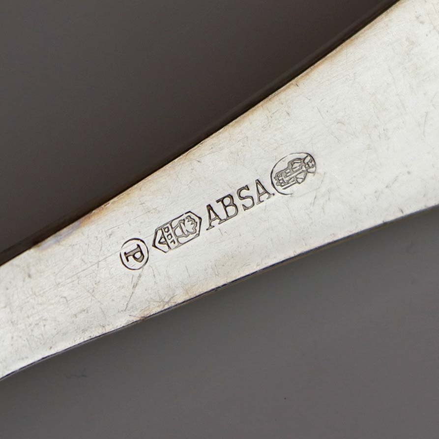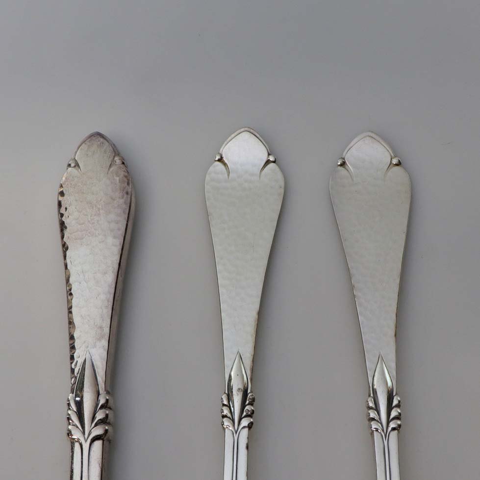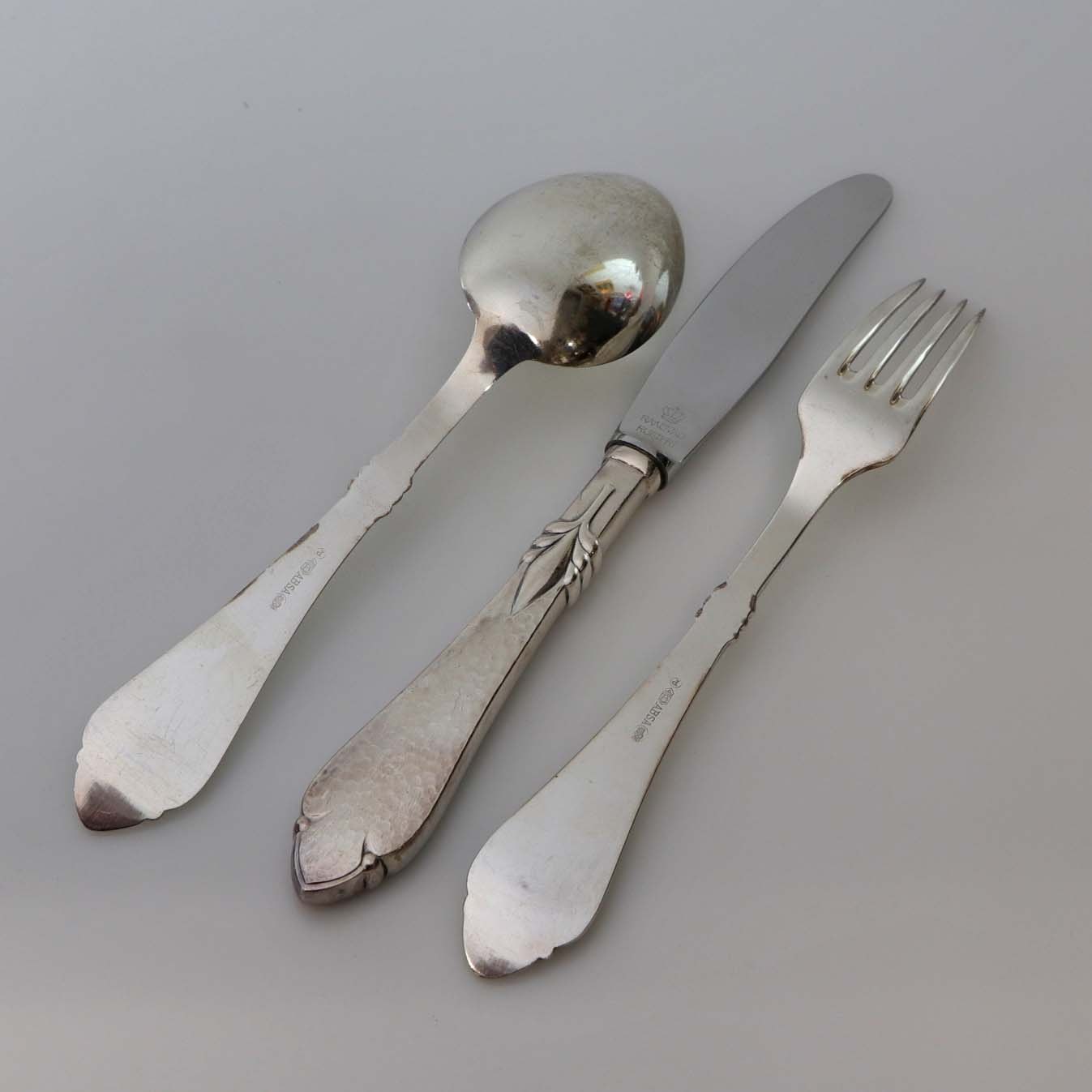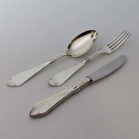 Bestik i banket pletsølv med liljeformet motiv navngivet Freja