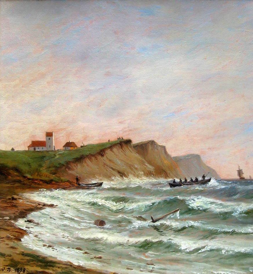 Dansk kunstner (19.årh): En redningsbåd går i søen ved Stevns Klint i baggrunden Højerup Kirke. Olie på pap. Signeret: J. B.1898. 40 x 37 cm. Der er lavet rigtig mange billeder med kirken og klinten, bl.a. har marinemaler C. F. Sørensen arbejdet her.