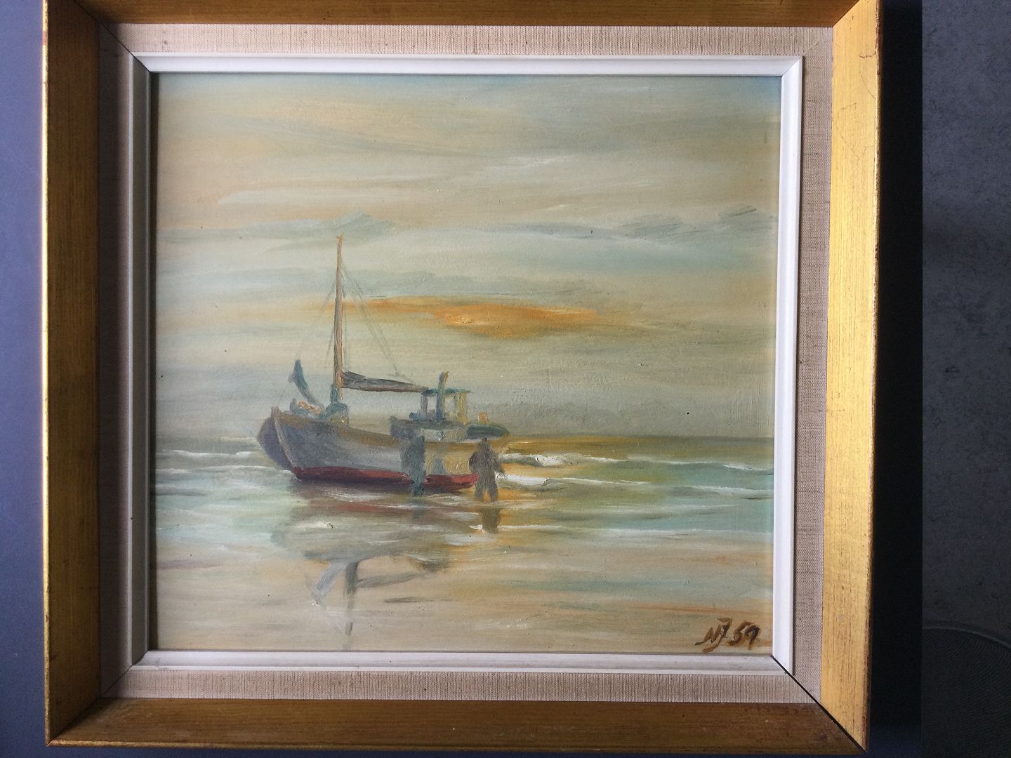 Maleri af Niels Jensen 1959 - Fiskekutter ved Standen, Blokhus.
