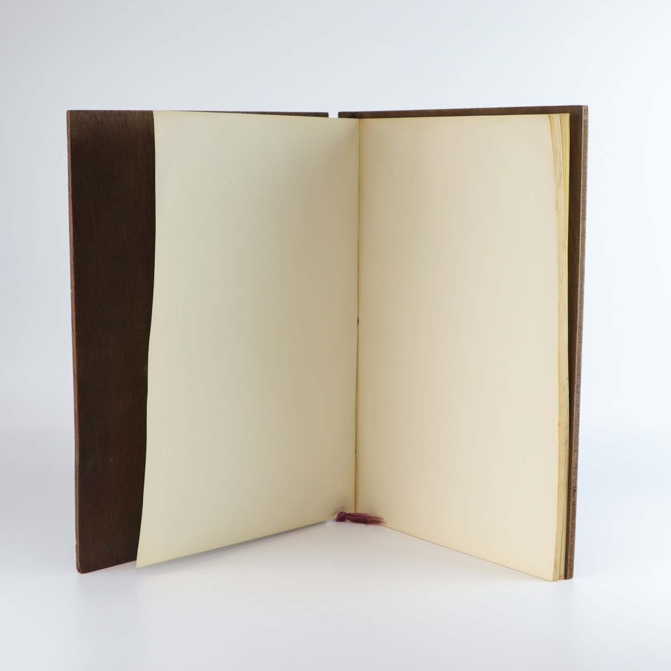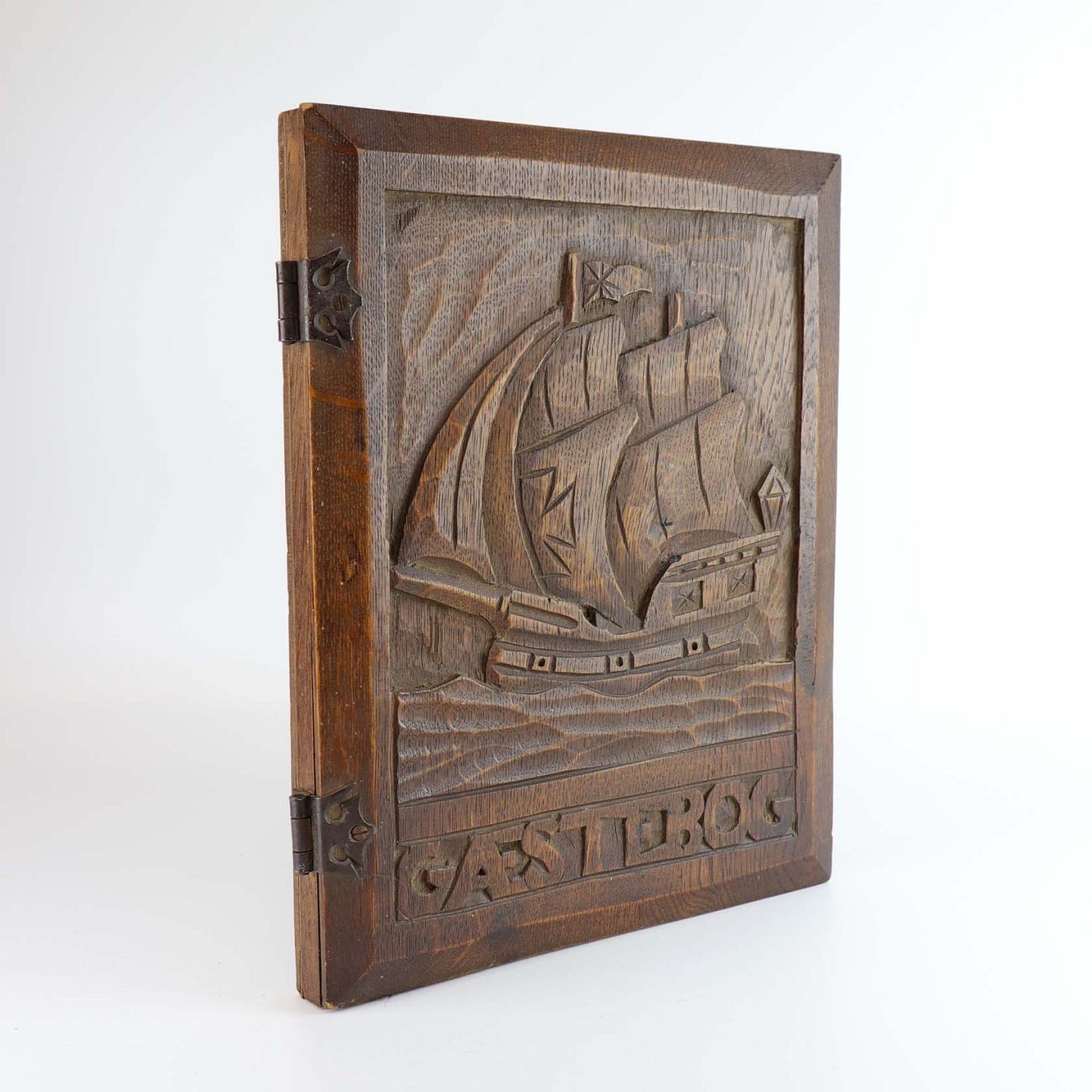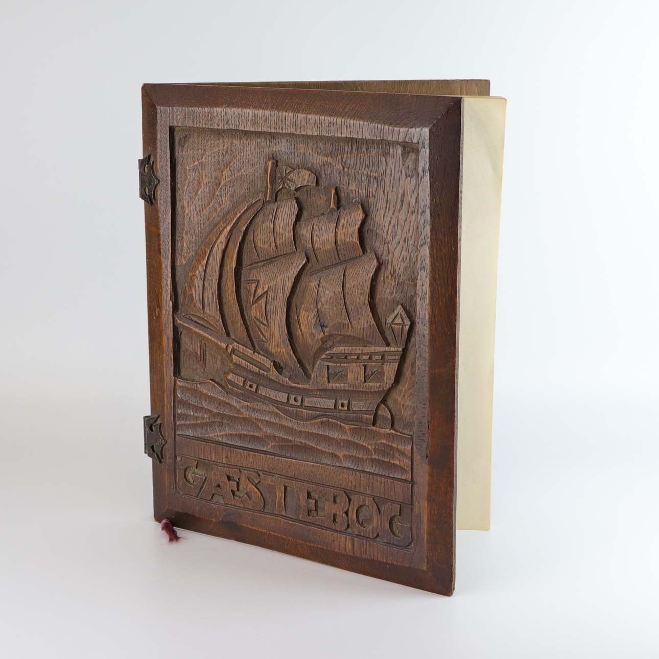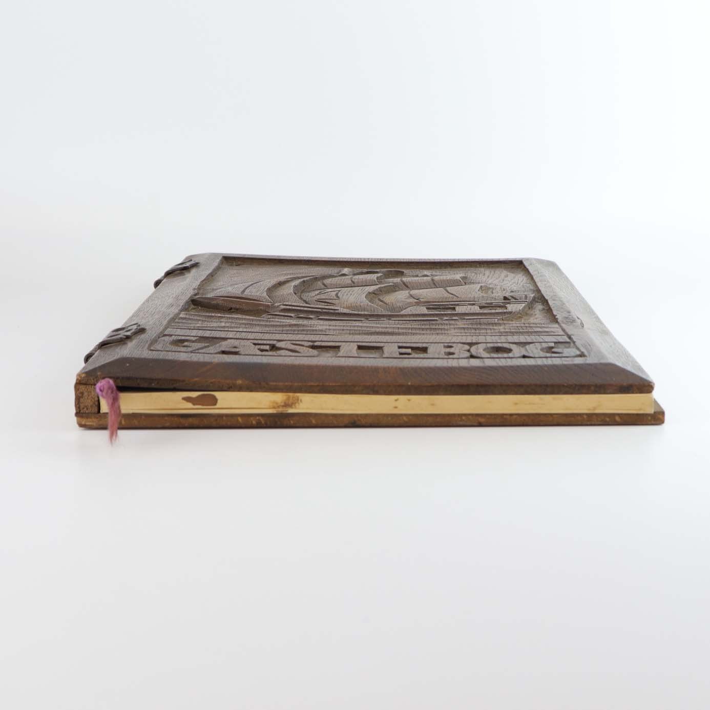 Gæstebog med blanke sider originale og omslag i karvet mørkt træ med motiv af gammel sejlskib på hav. Bogens hængsler er fremstillet i metal og papiret er fastgjort med lilla snor.