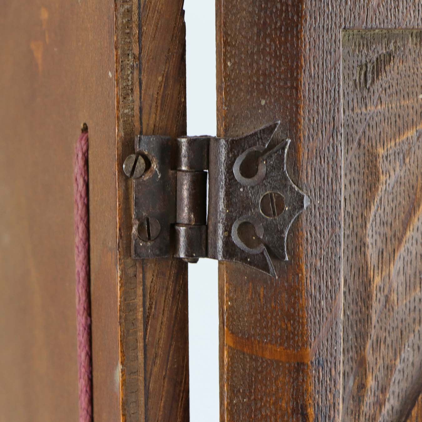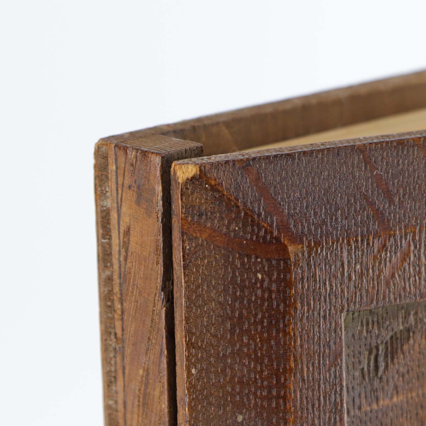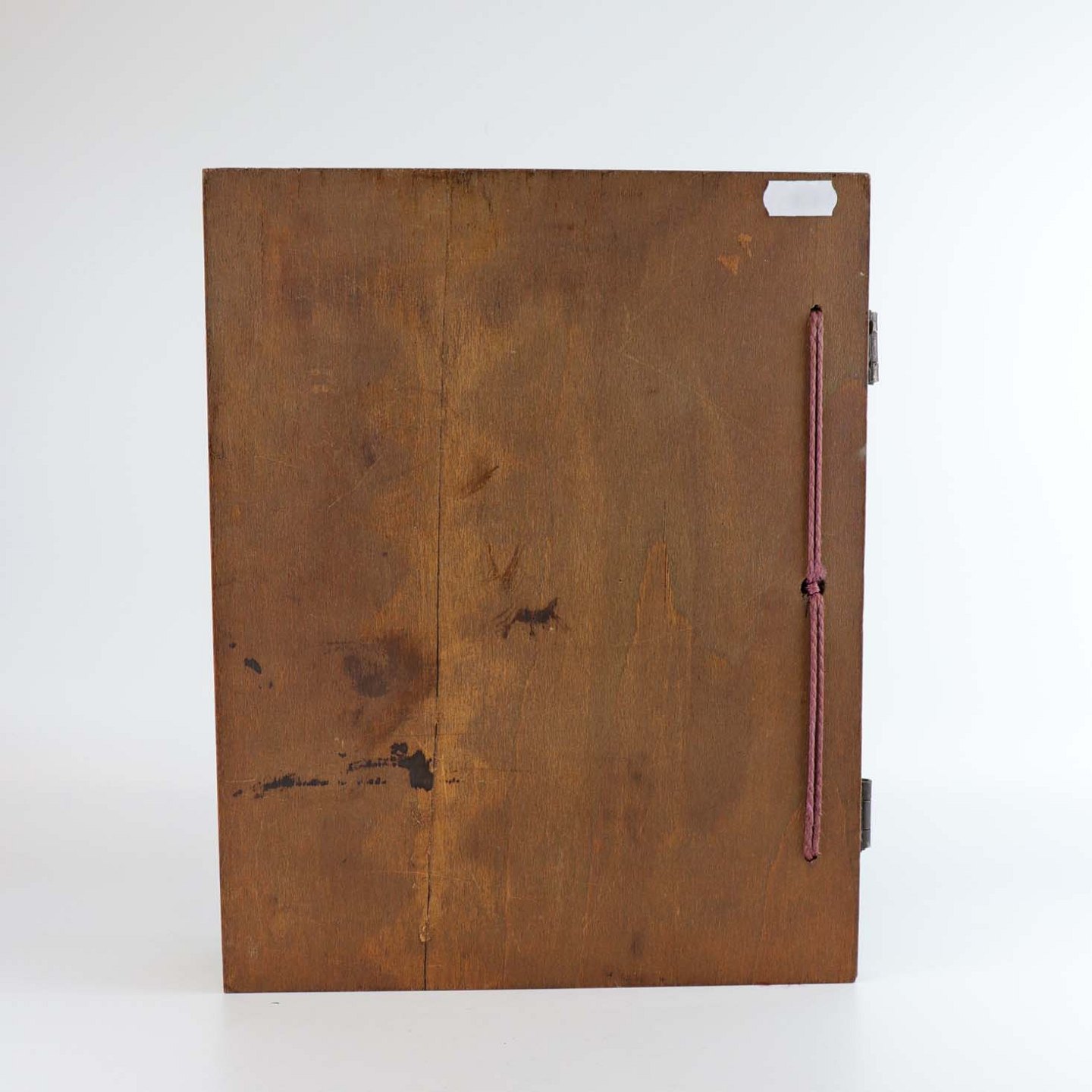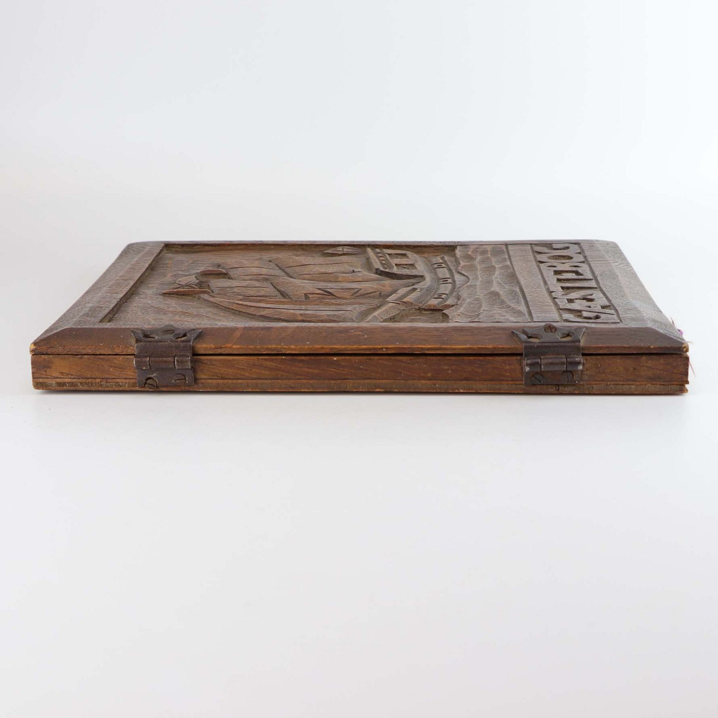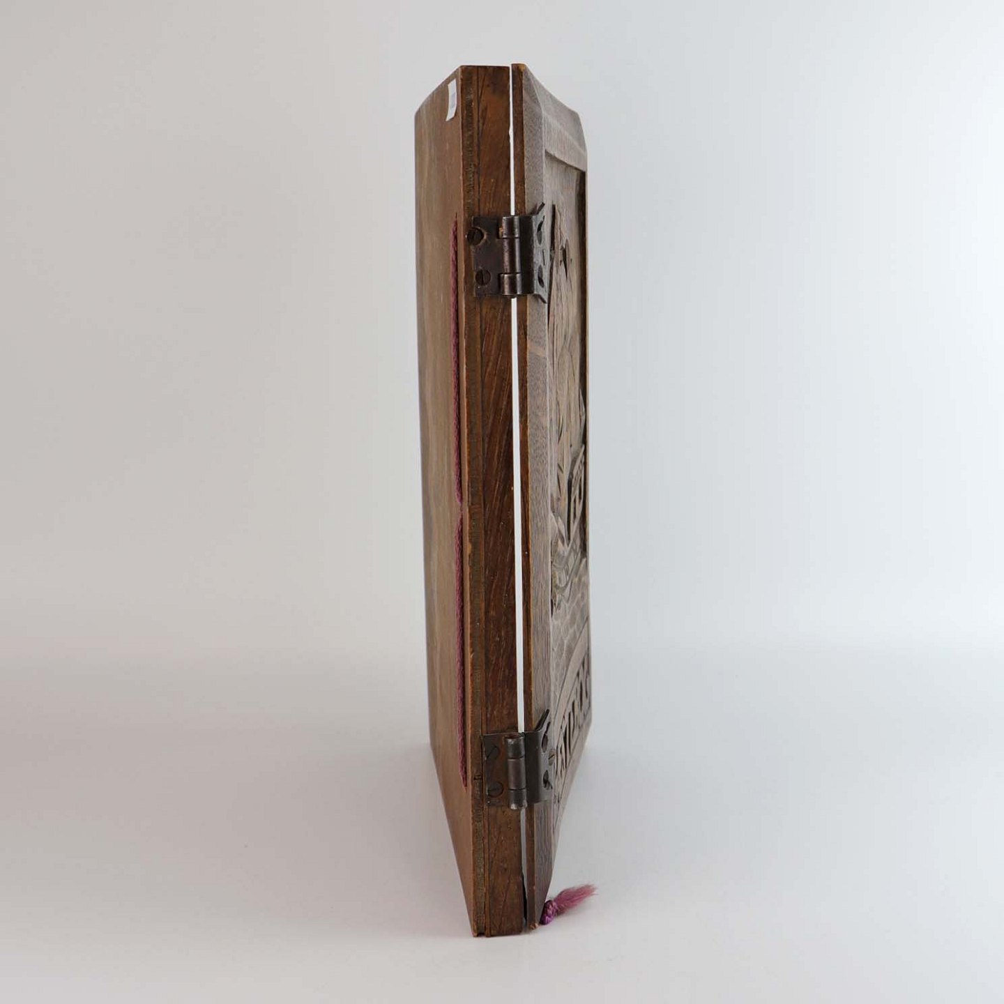 Gæstebog med blanke sider originale og omslag i karvet mørkt træ med motiv af gammel sejlskib på hav. Bogens hængsler er fremstillet i metal og papiret er fastgjort med lilla snor.