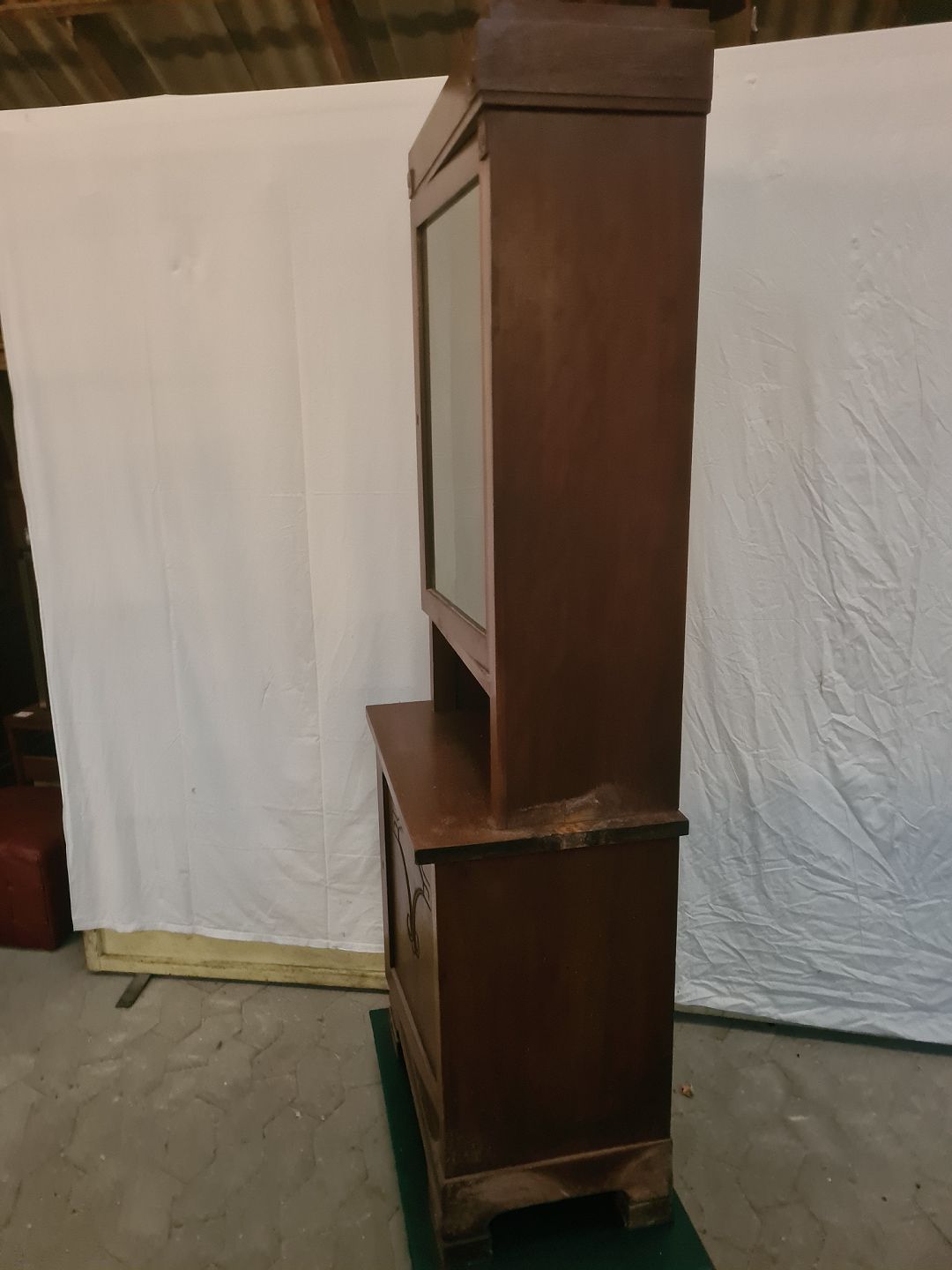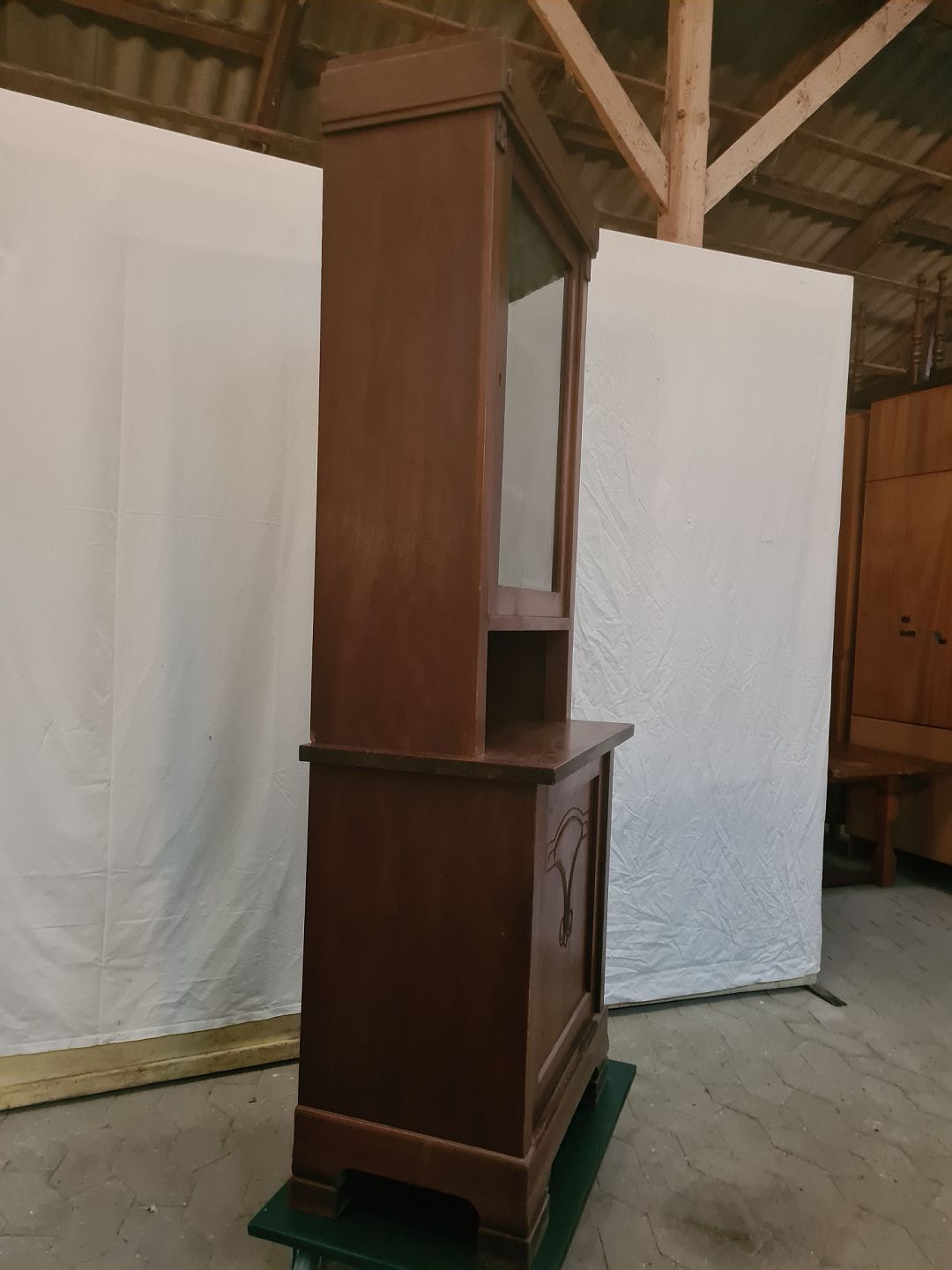 Skab i fineret mahogni med vitrine overdel, fra 1910erne.
