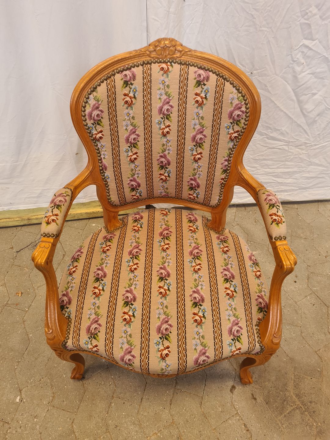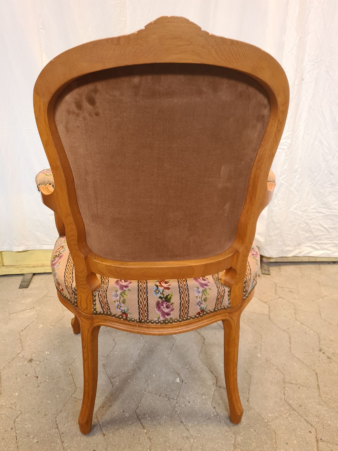 Stol i massivt bægetræ med broderet sæde, fra 1950erne.