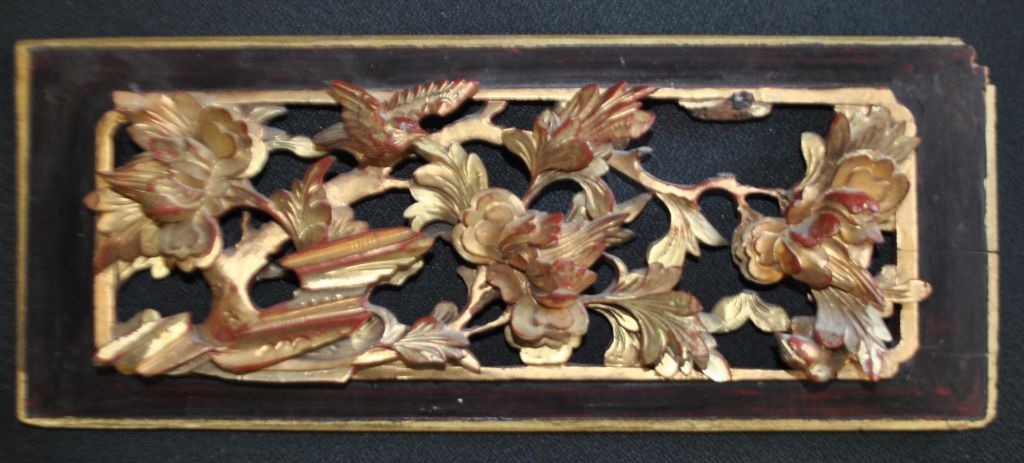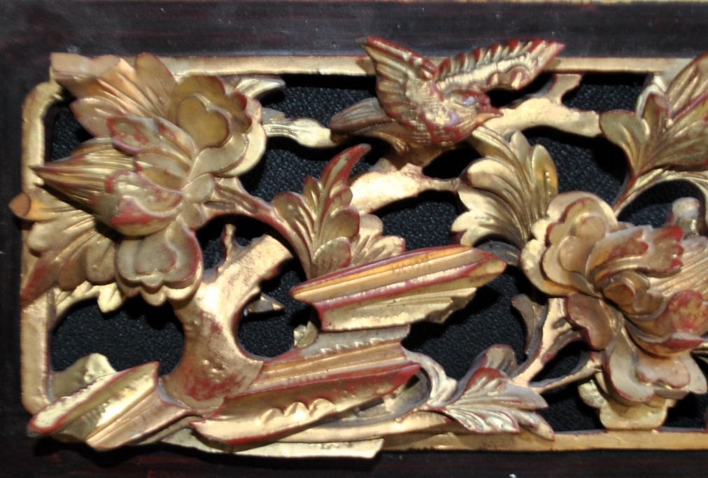 Rødmalet kinesisk træskæring med forgyldning, 19. årh. Skæringer i form af bladværk og små fugle. 15 x 38,5 cm.