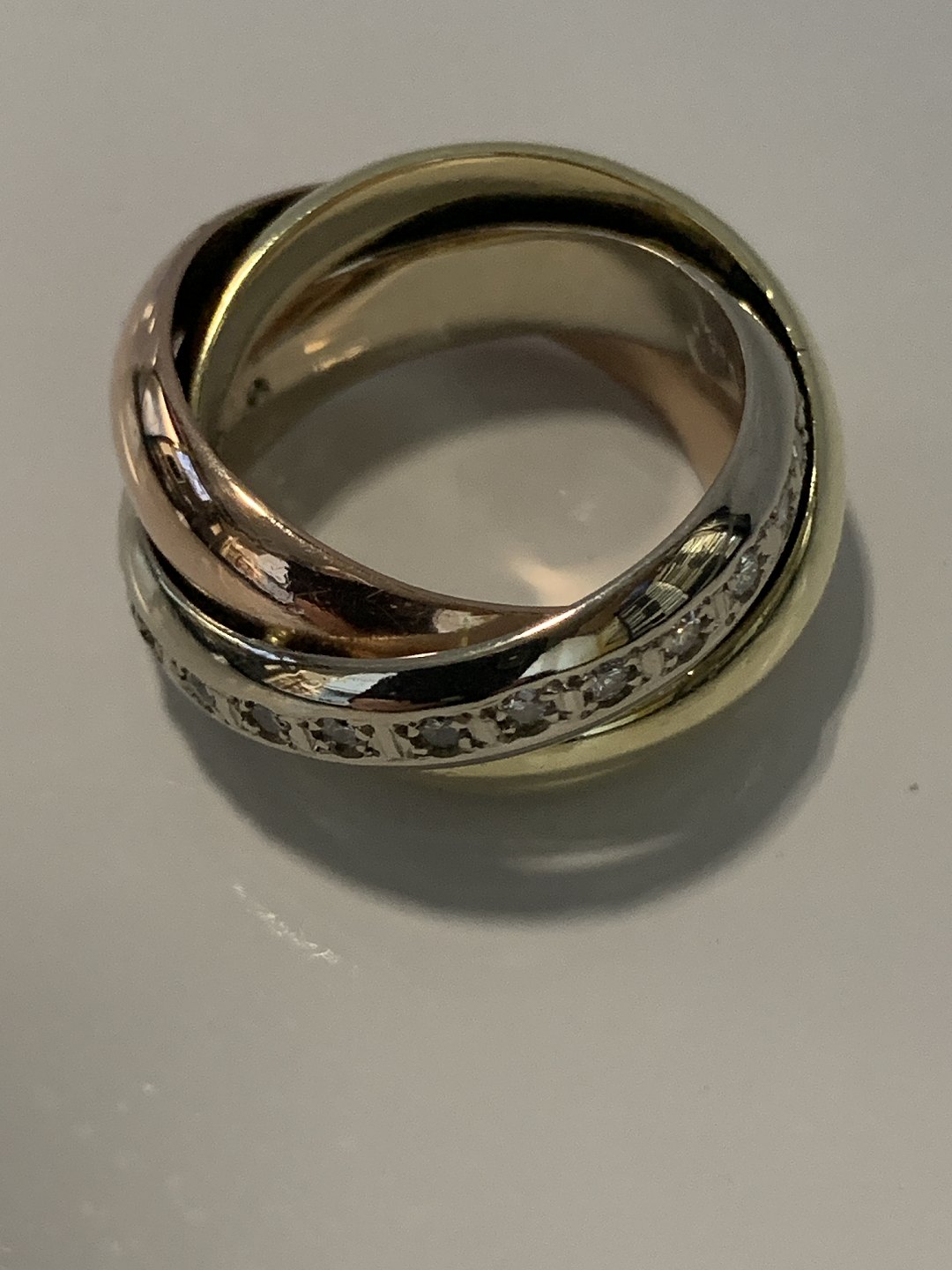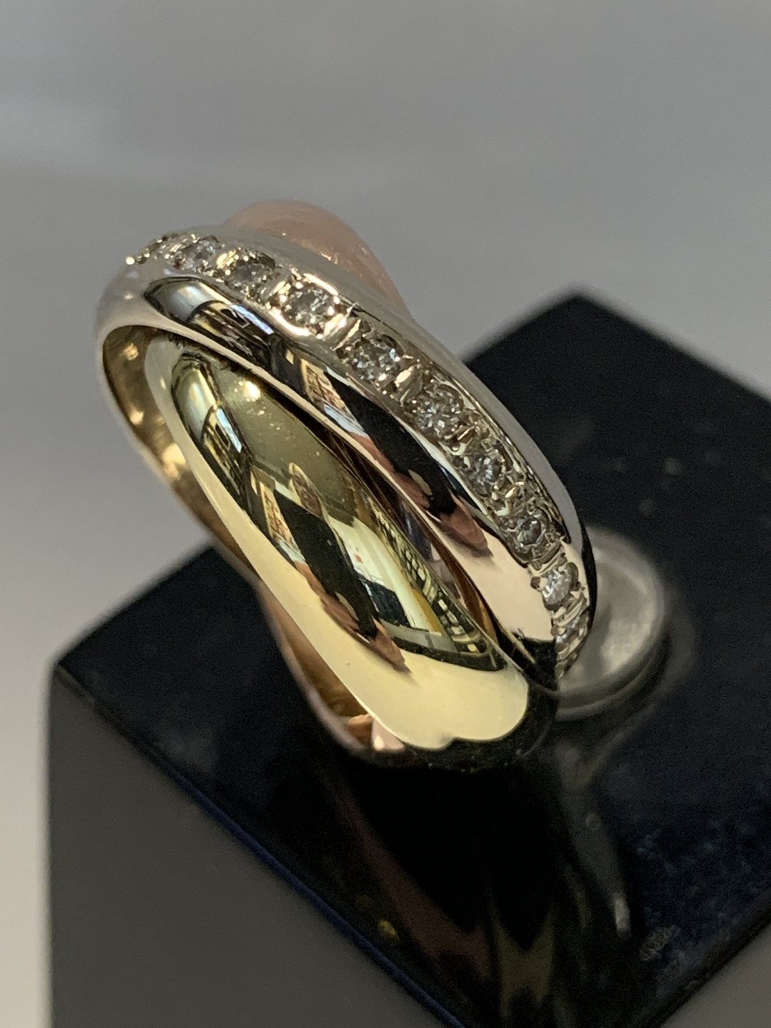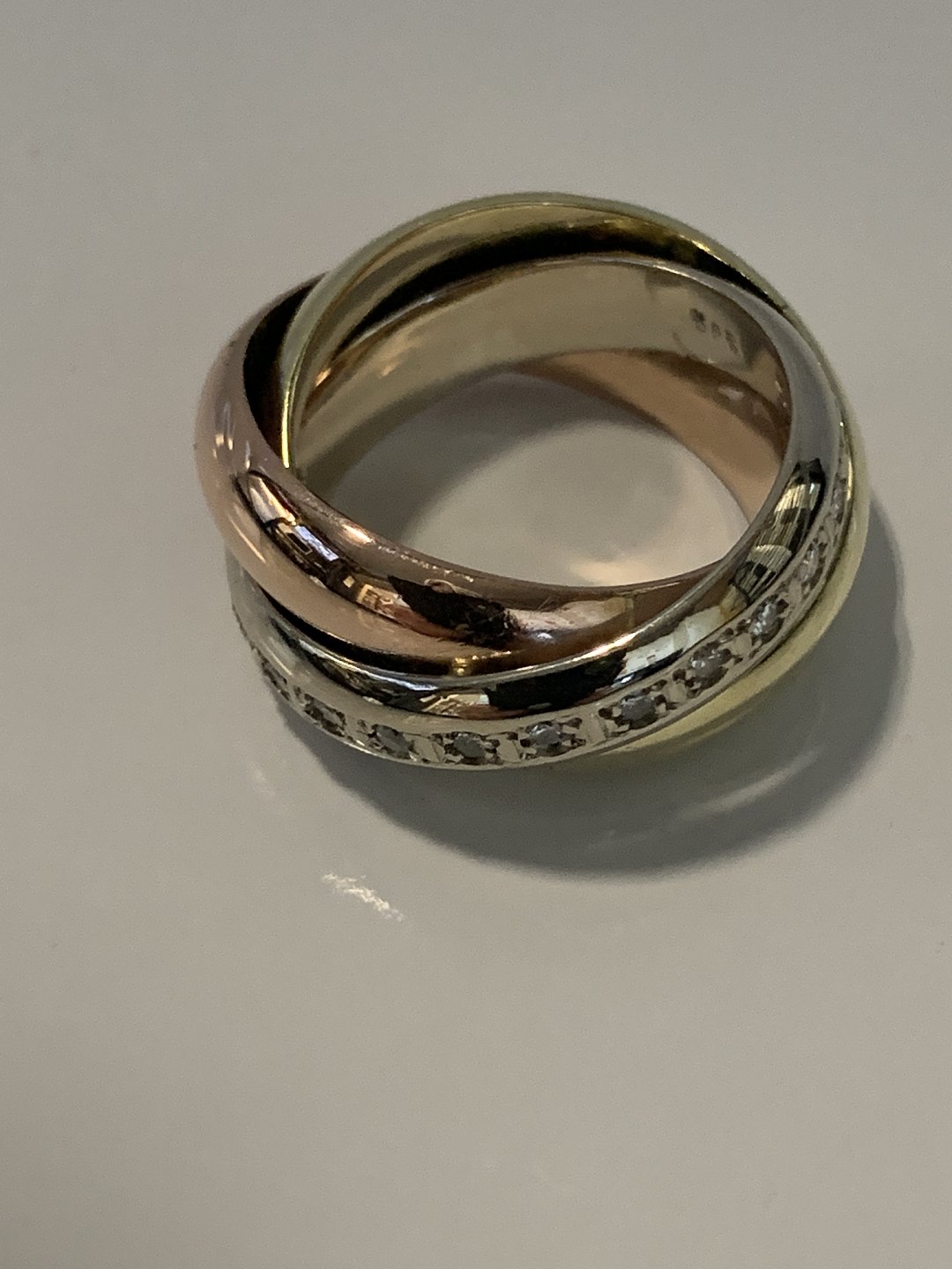 Gold ring with diamonds in 14 carat gold The rings are in 3 different types of gold, red gold, white gold & yellow gold.