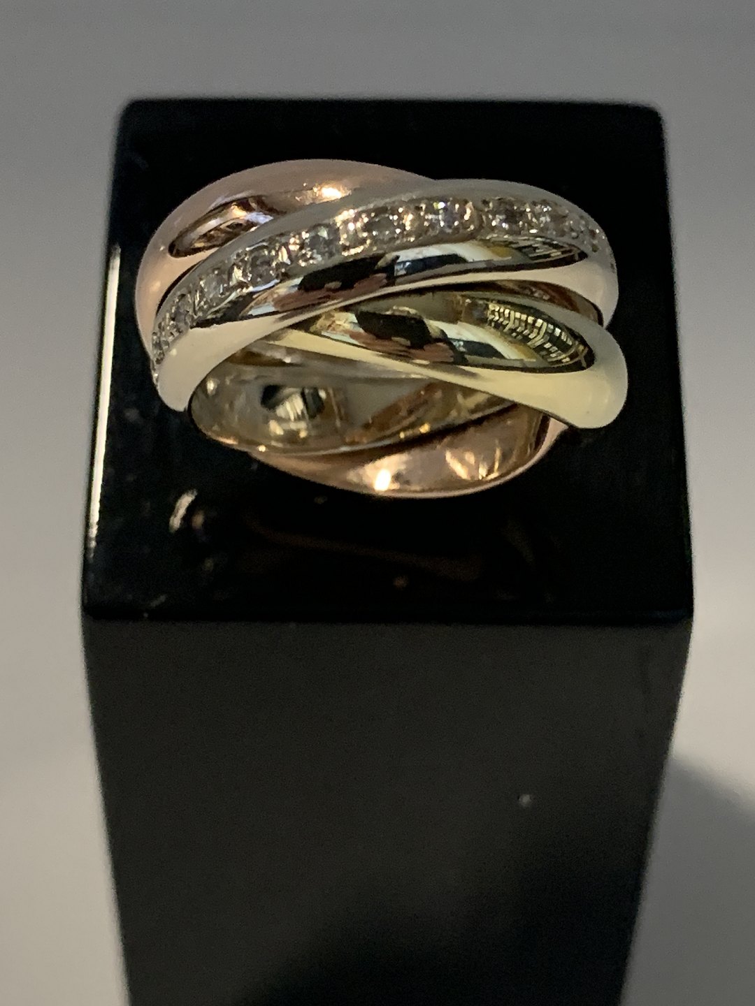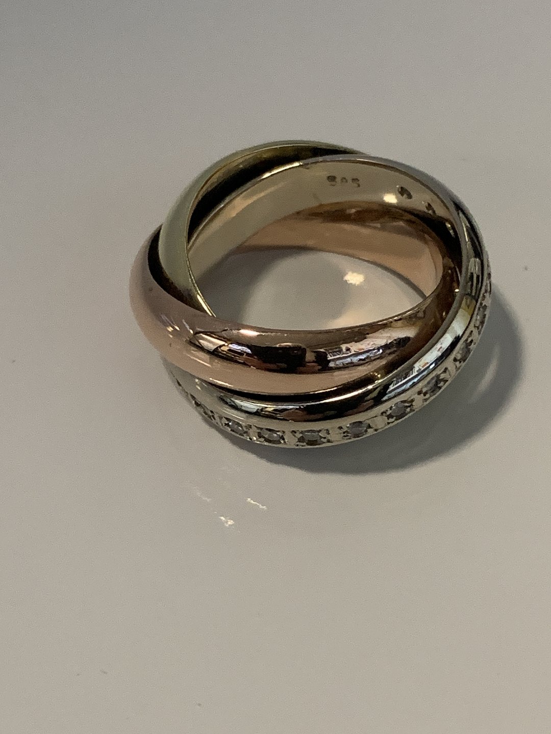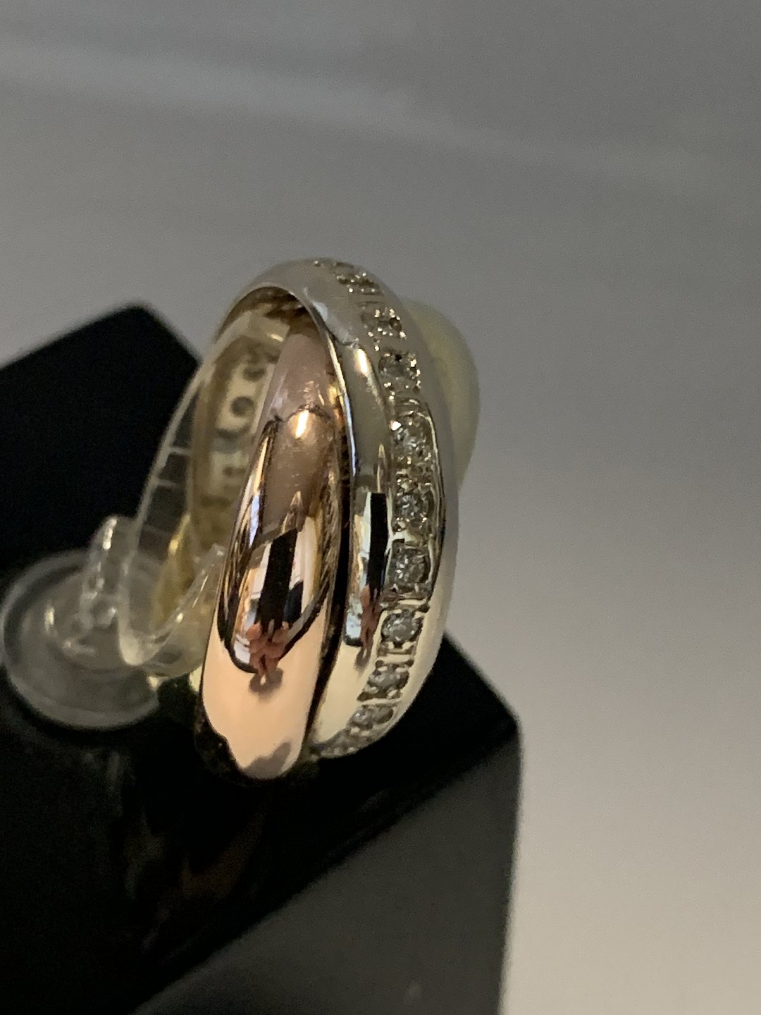 Gold ring with diamonds in 14 carat gold The rings are in 3 different types of gold, red gold, white gold & yellow gold.