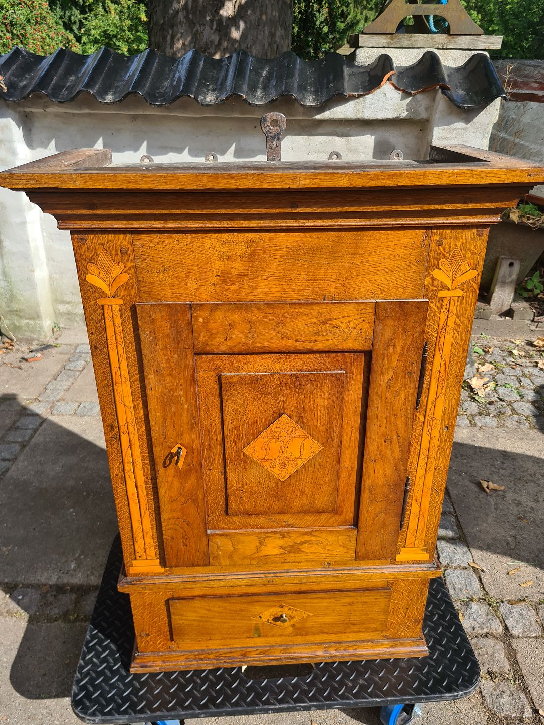 Antikt vægskab fra 1800 tallet i eg og med intarsia. Fremstår meget pænt og velholdt for alderen uden videre brugsspor. Alle skuffer bliver låst med lågen. Aldeles funktionsdygtigt.