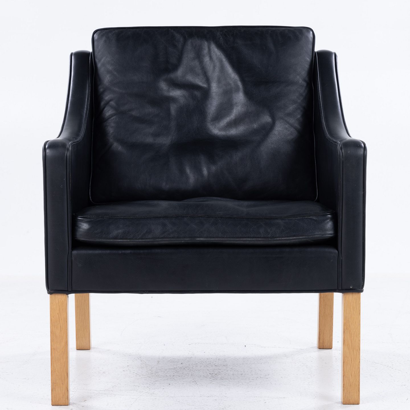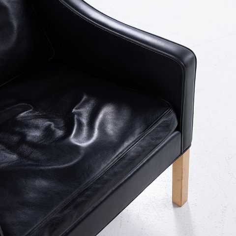 BM 2207 - Lænestol i originalt, sort læder med ben i lys eg.