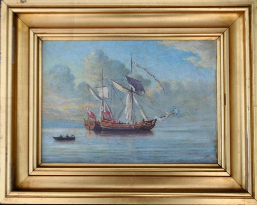 Engelsk kunstner (19. årh.): To engelske skibe mødes på havet. Olie på lærred. Utydelig signeret. 24 x 34 cm. Indrammet: 36 x 46 cm.