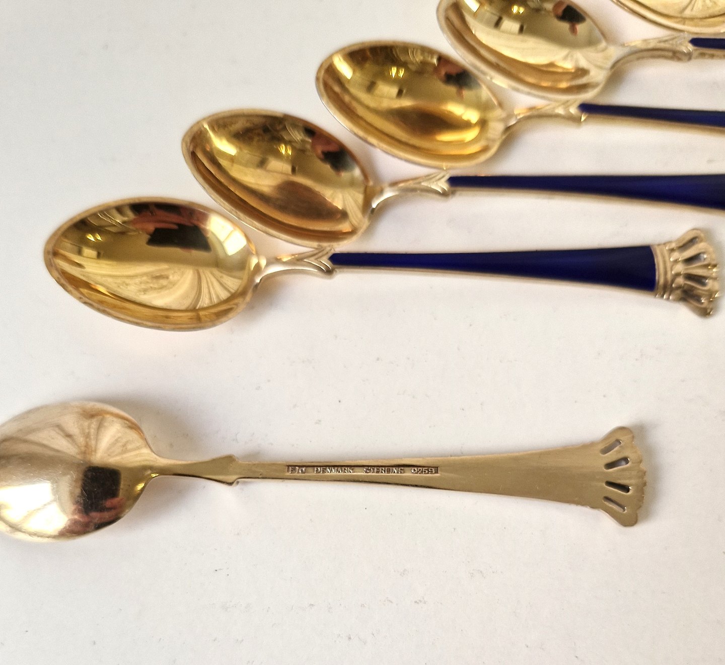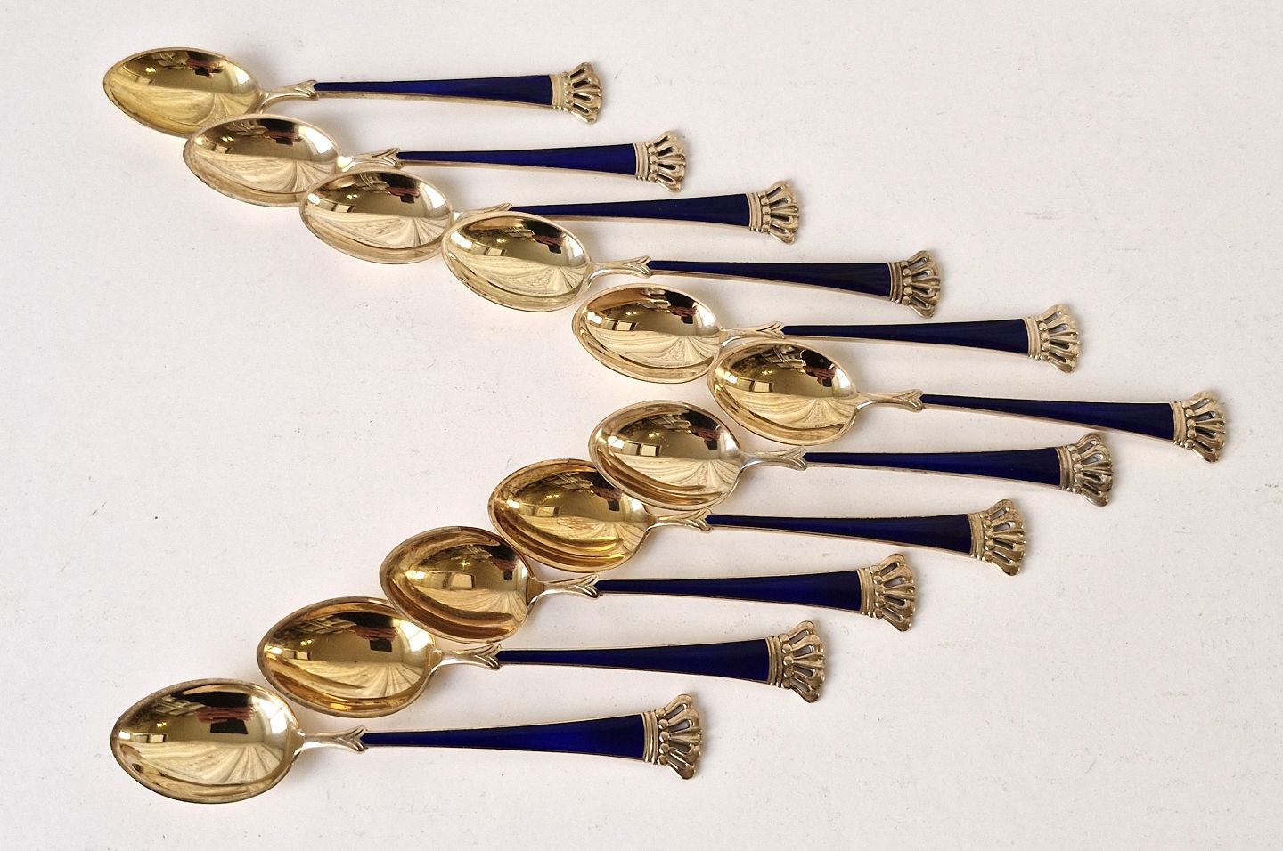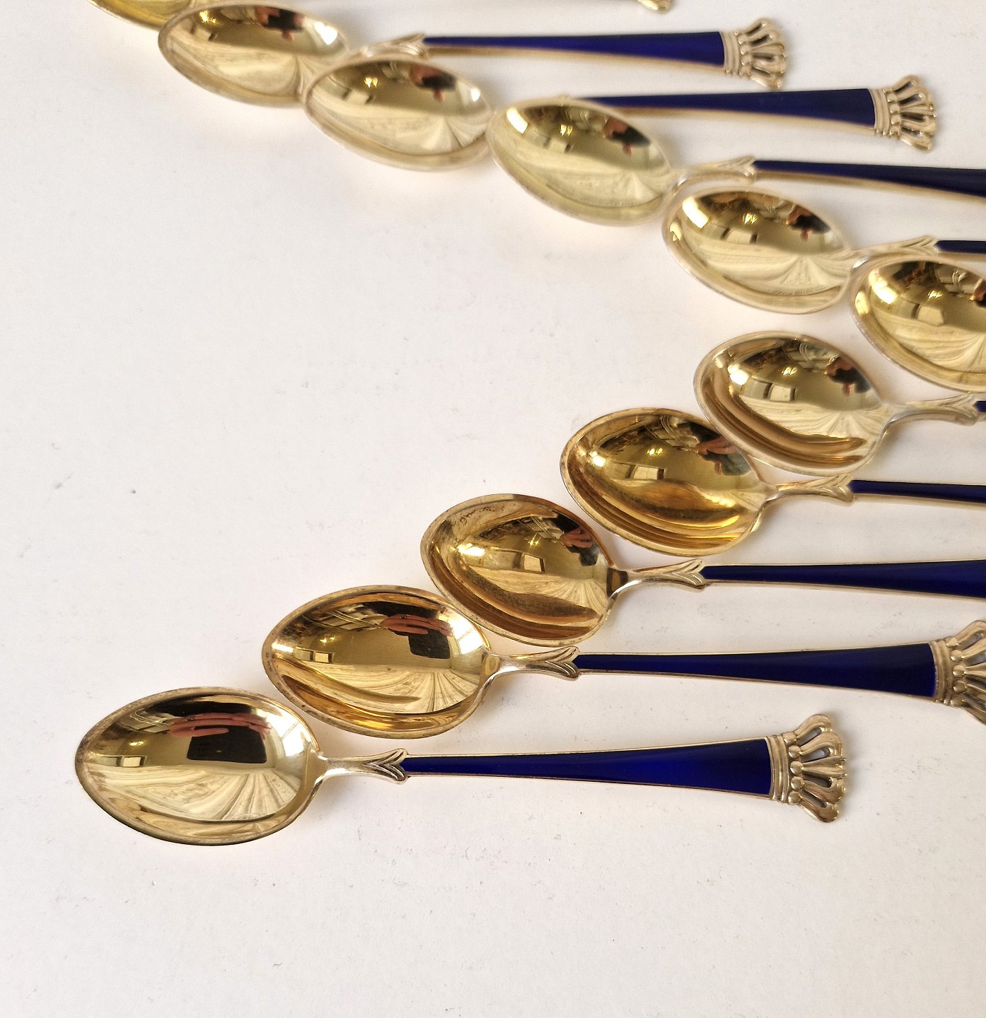 Sæt på 11 stk kaffeskeer i forgyldt sterlingsølv og blå emalje dekoreret med en kongekrone