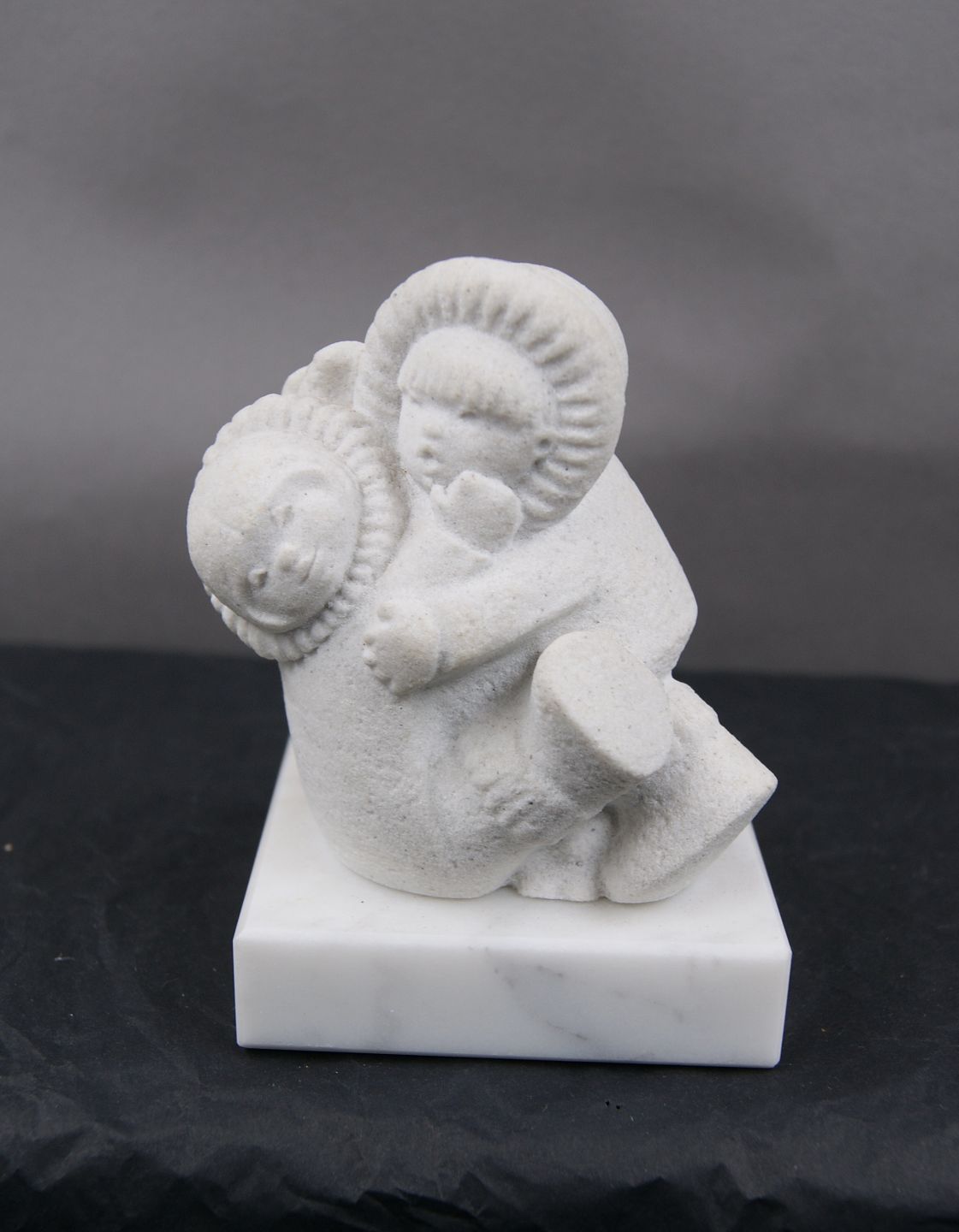 Weiße Steinkunstfigur aus Marbell, Belgien. Mädchen mit kleiner Schwester
