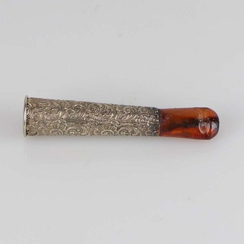 Cigaret rør i sølvplet dekoreret med blomstermotiver og med mundstykke af rav. Røret kommer med tilhørende æske.
