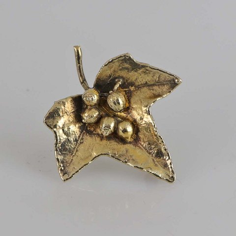 Broche i forgyldt sterling sølv formet som et trefingeret blad med fem bær