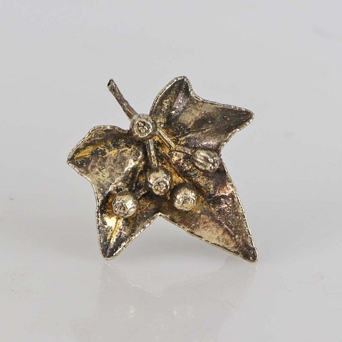 Broche i forgyldt sterling sølv formet som et trefingeret blad med fem bær