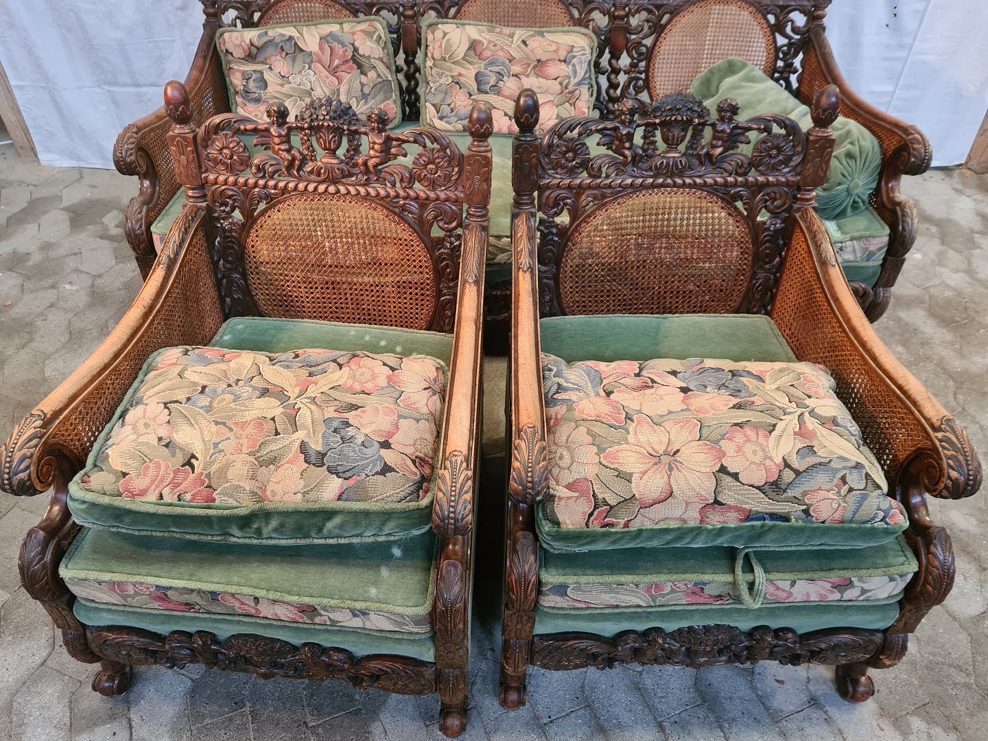 Sofa med 2 lænestole i massivt egetræ og rørflet, fra 1930erne.