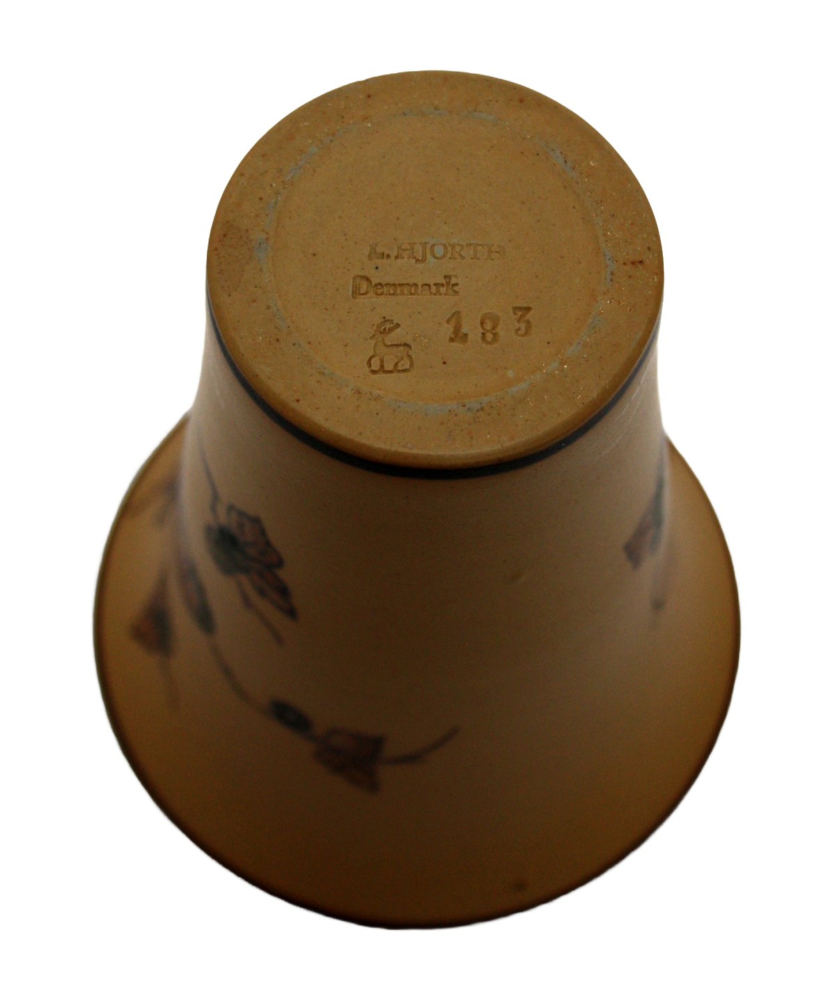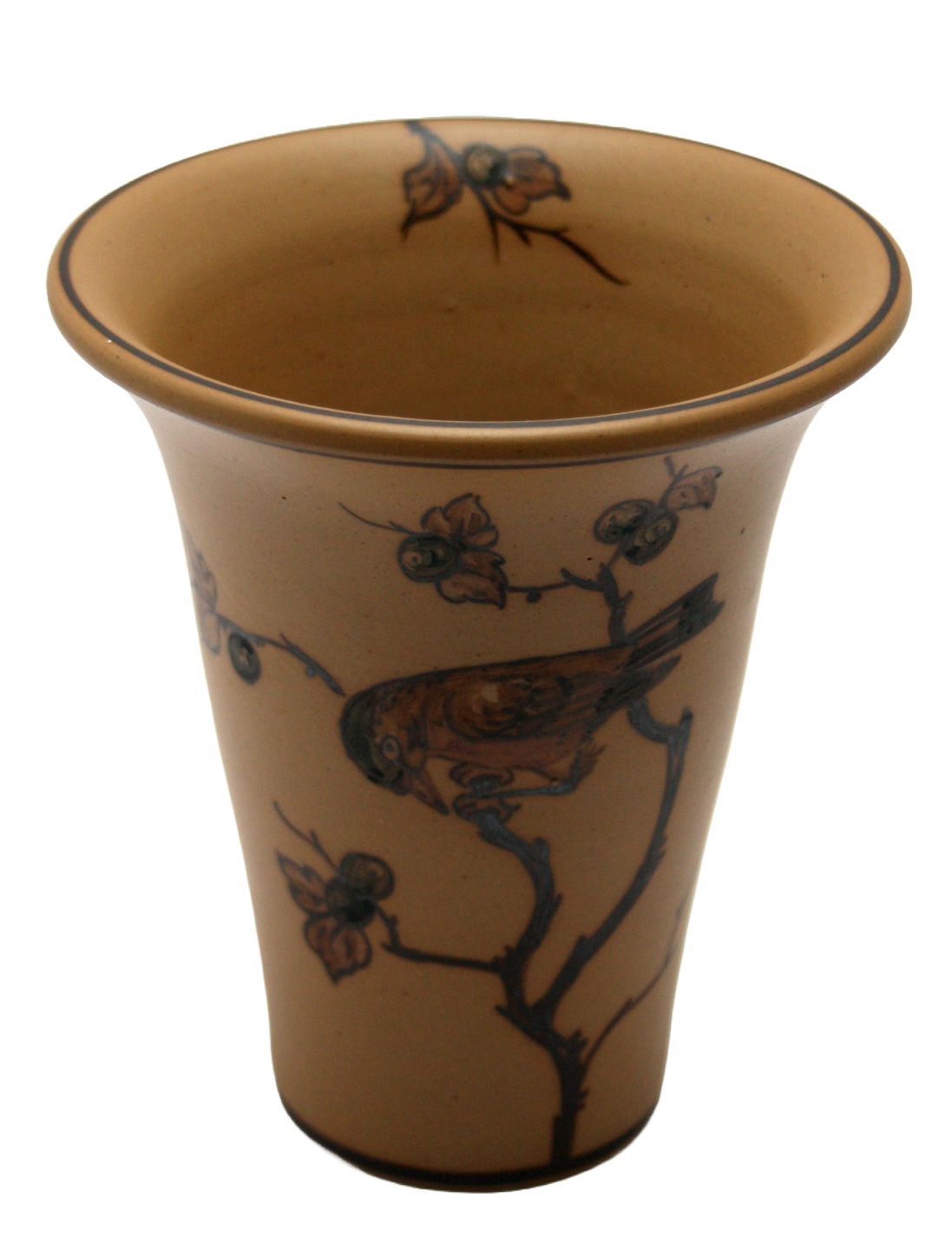 L. Hjorth, Bornholm, Vase i brun keramik med fugl på gren og blå bær. Nr. 183. Stempel med hjort og L. Hjorth Denmark. Højde 14 cm. Øverste diameter 12 cm. Fin stand. Pris: 300 kr.