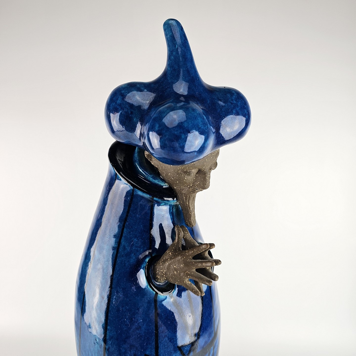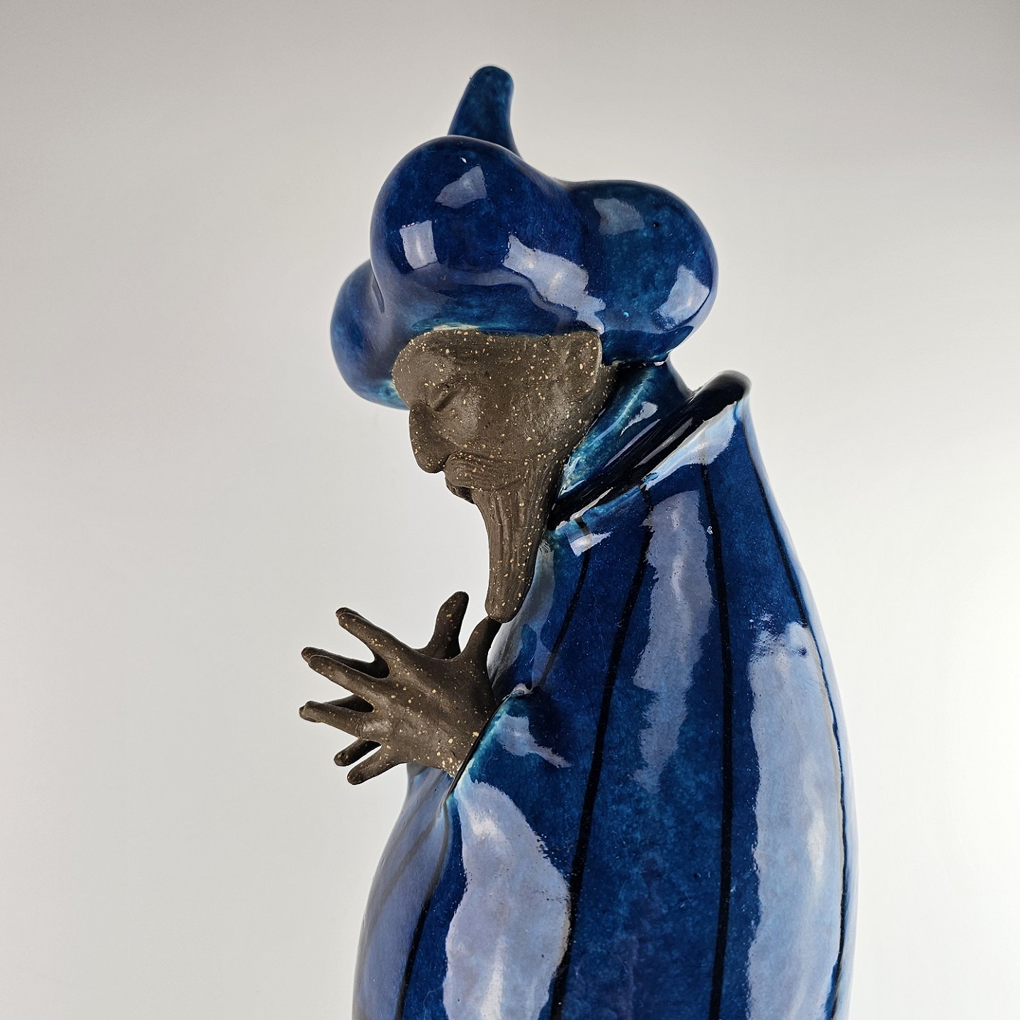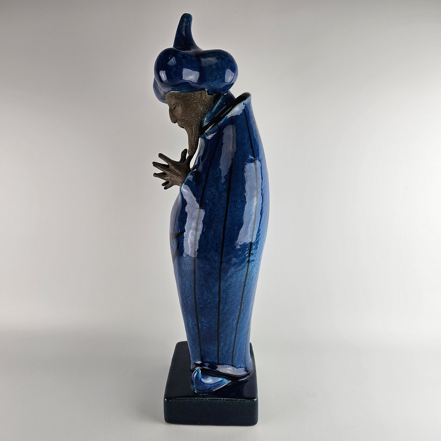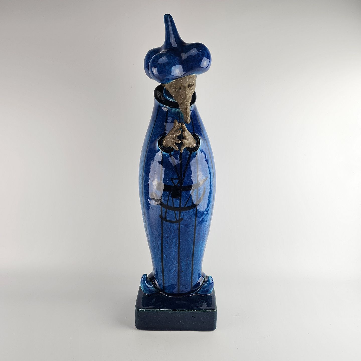 Figur i delvis glaseret stentøj med motiv af mand med østerlandsk beklædning i blå farve som er navngivet Storvesiren. Nr. 21700