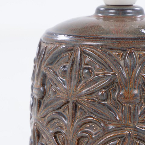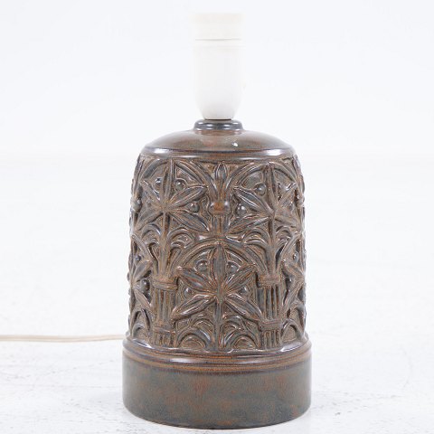Bordlampe i stentøj med mønster i brunlig glasur.