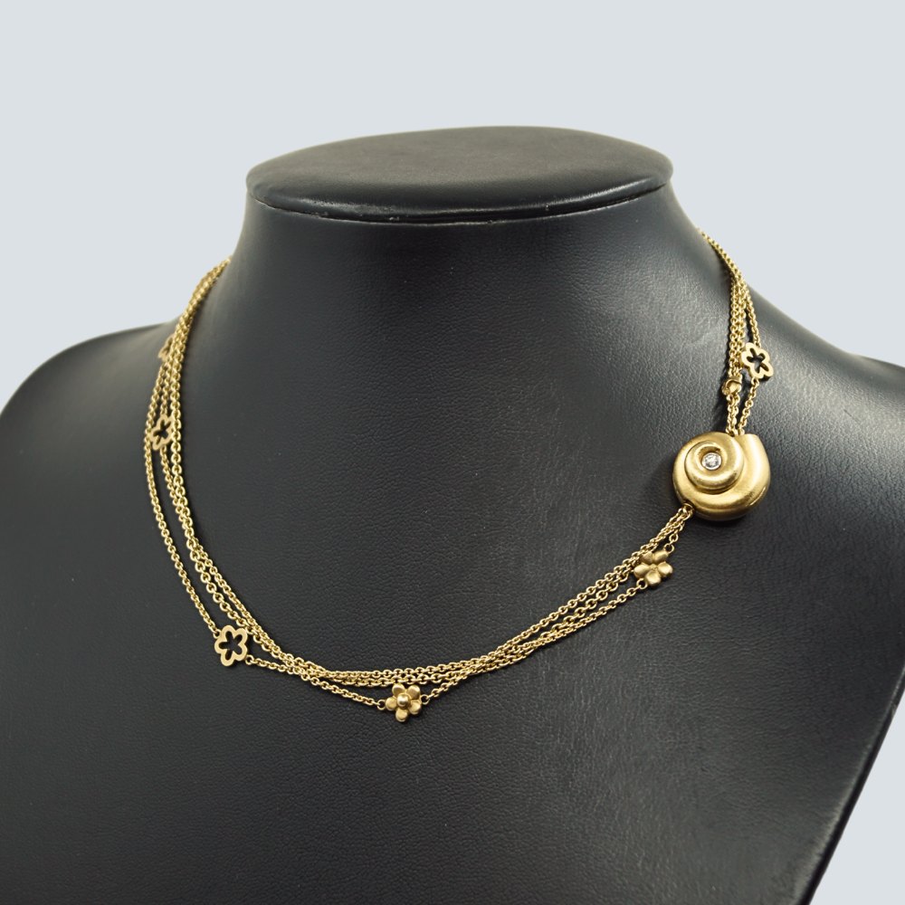 OBS! Halskæden sælges separat. Ole Lynggaard blomsterhalskæde i 14 kt. guld. Tre-kæder-i-én. Stempet "Ole L 585". Længde 37,5 cm.