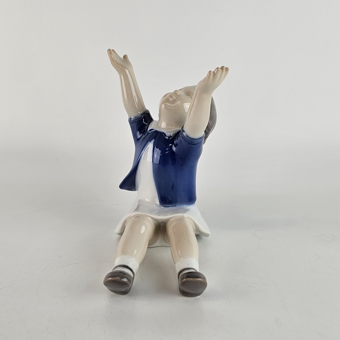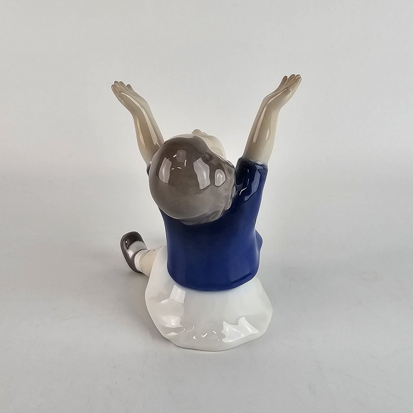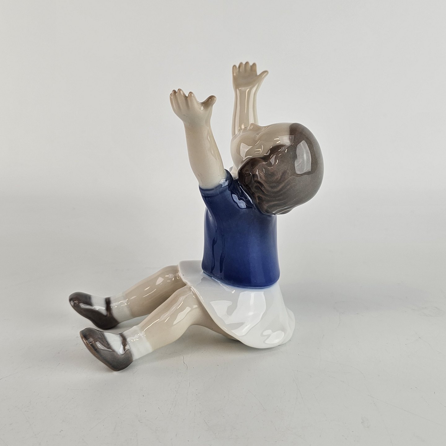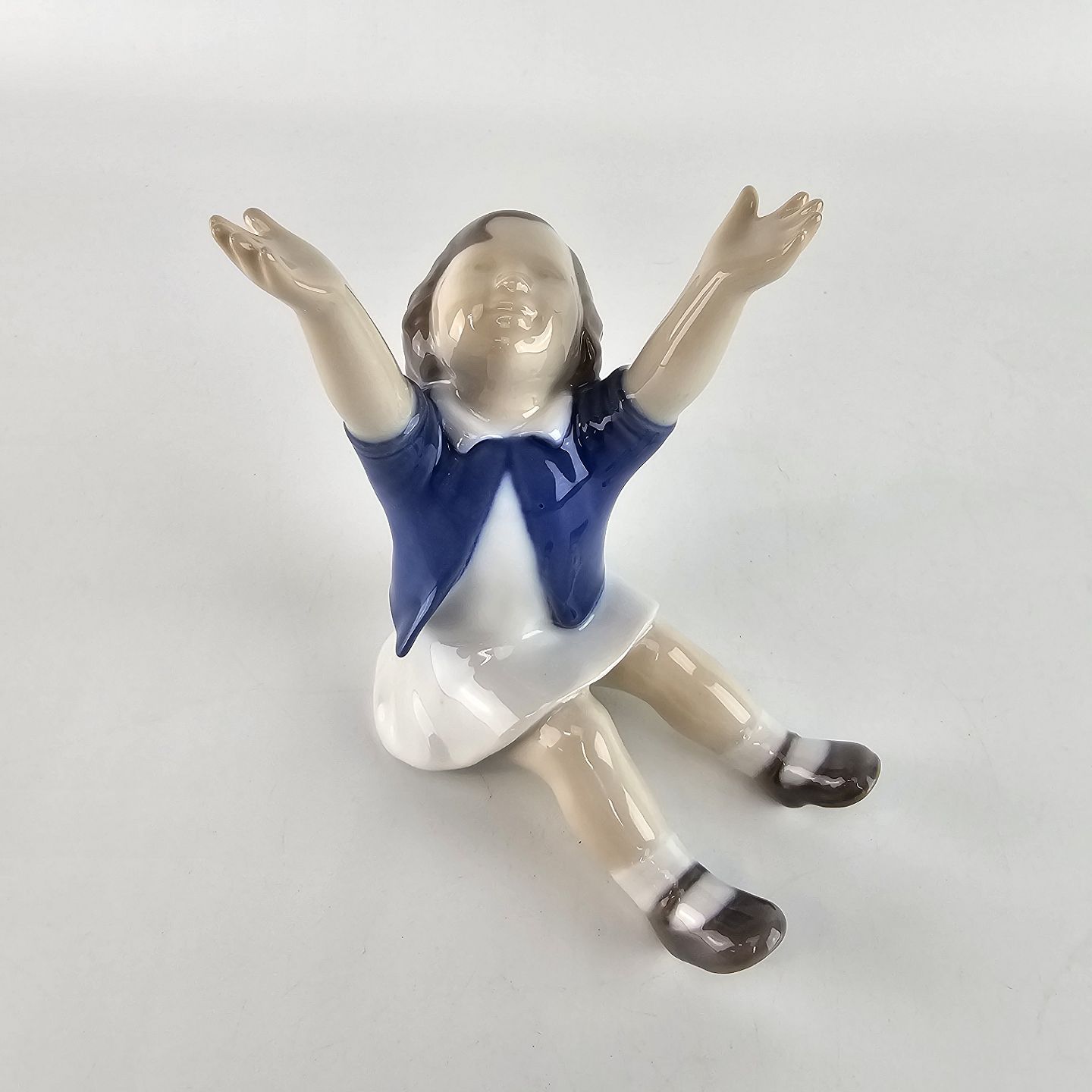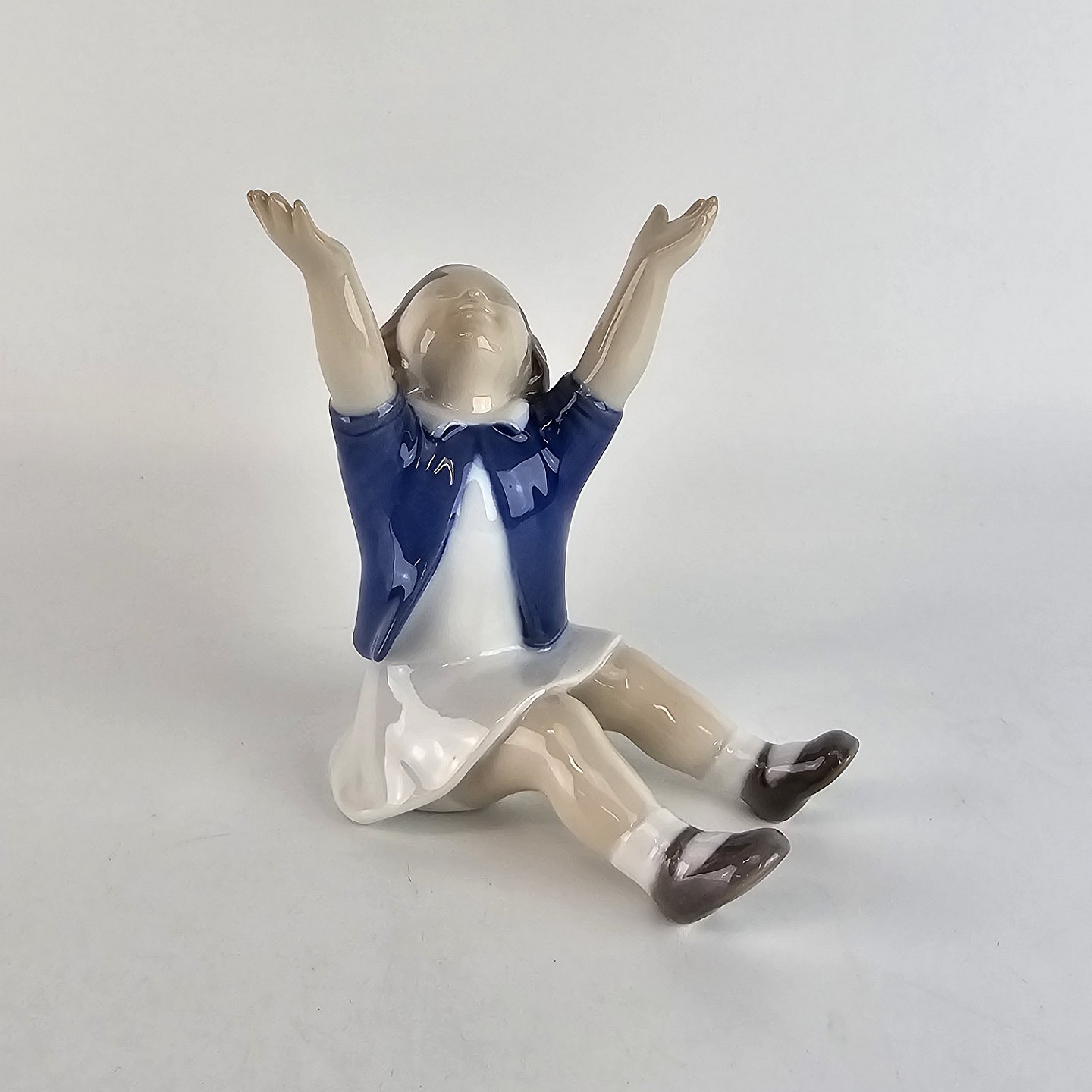 Figur i porcelæn med motiv af en siddende pige med armene løftet. Figuren er navngivet Op til mor. Nr. 2324