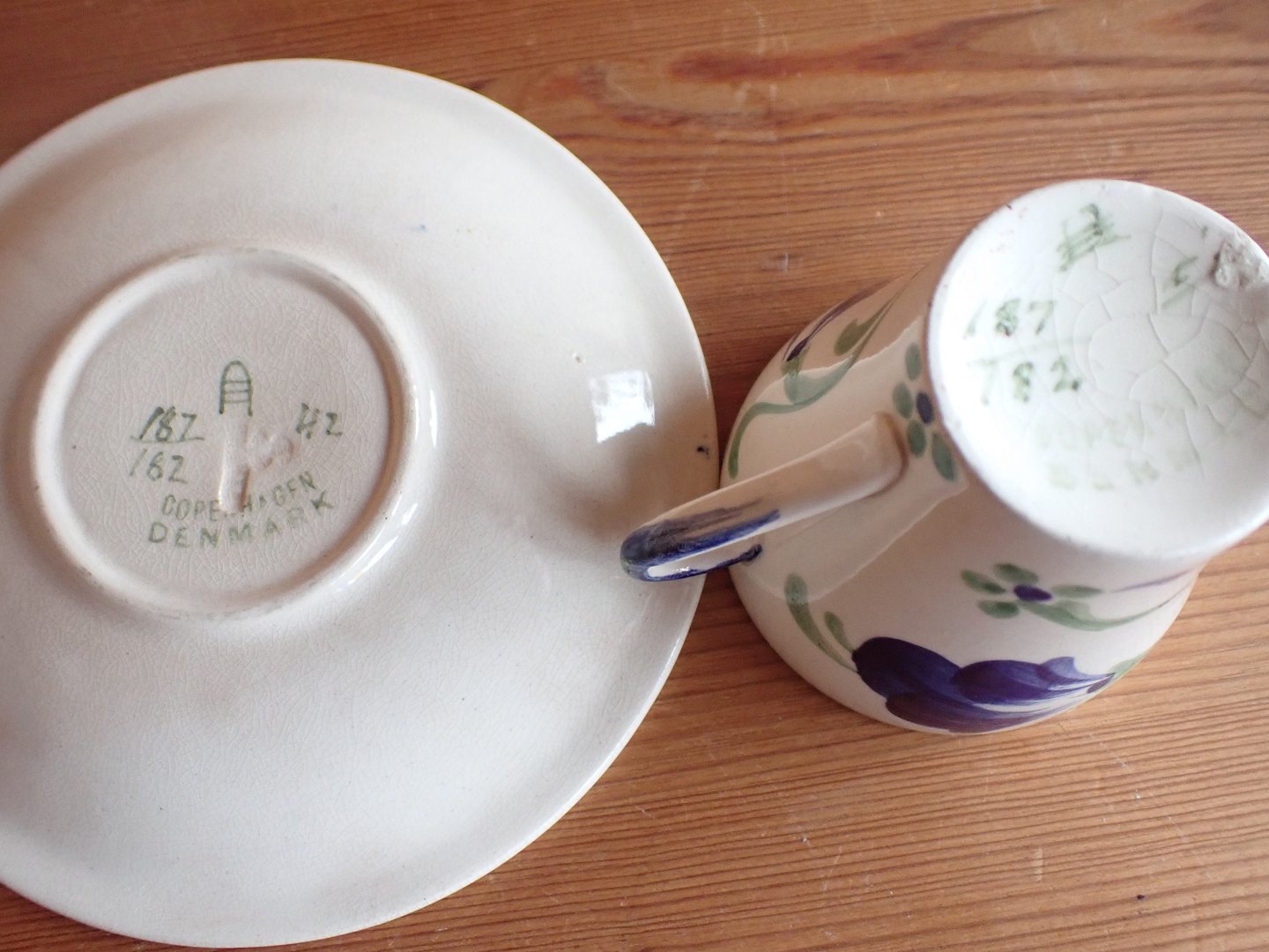 Text available in Danish: Aluminia Sværdlilie/Blå Cenerarier fajance kaffekop 187/182, lille kop med underkop. Designer: Harald Slott-Møller 1903. Mål: Kop foroven: 6,5 cm., højde: 6,2., diameter underkop:13,3 cm. I pæn stand i forhold til alde med lette kakkeleringer..