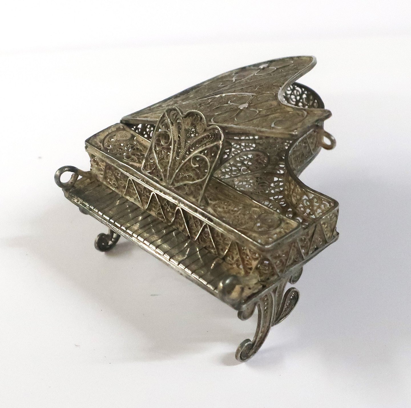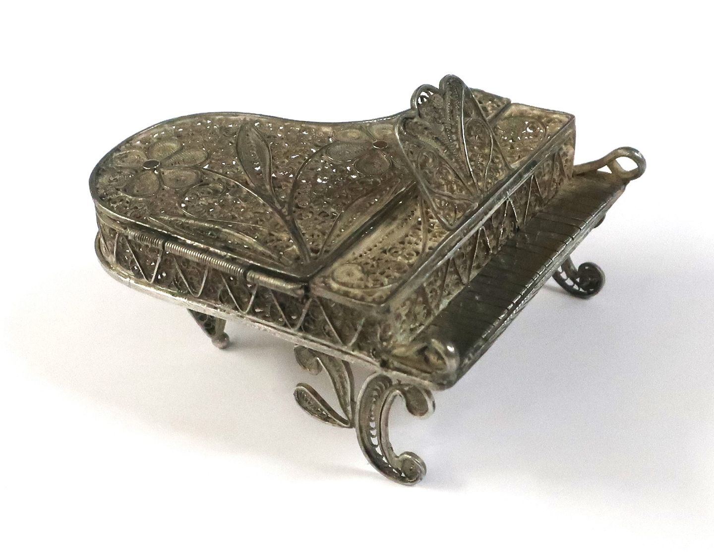 Lille minature flygel i filigran sølv (800). Længde 6,6 cm. Højde 3,3 cm