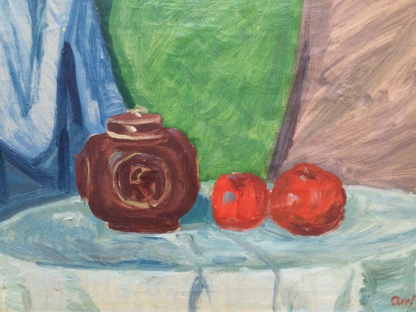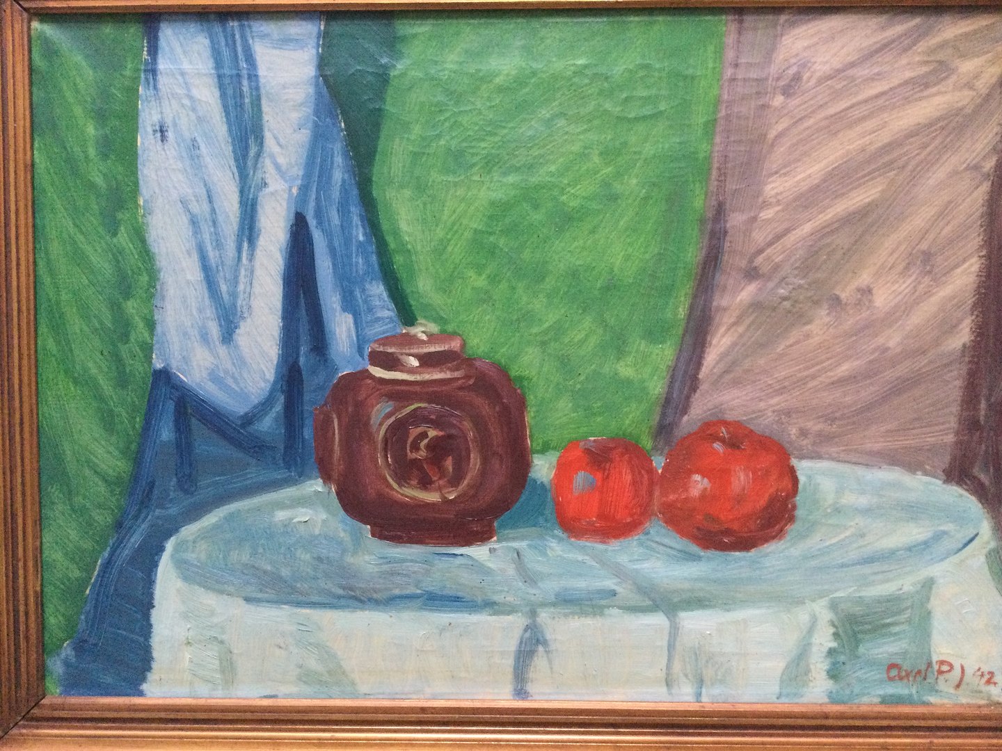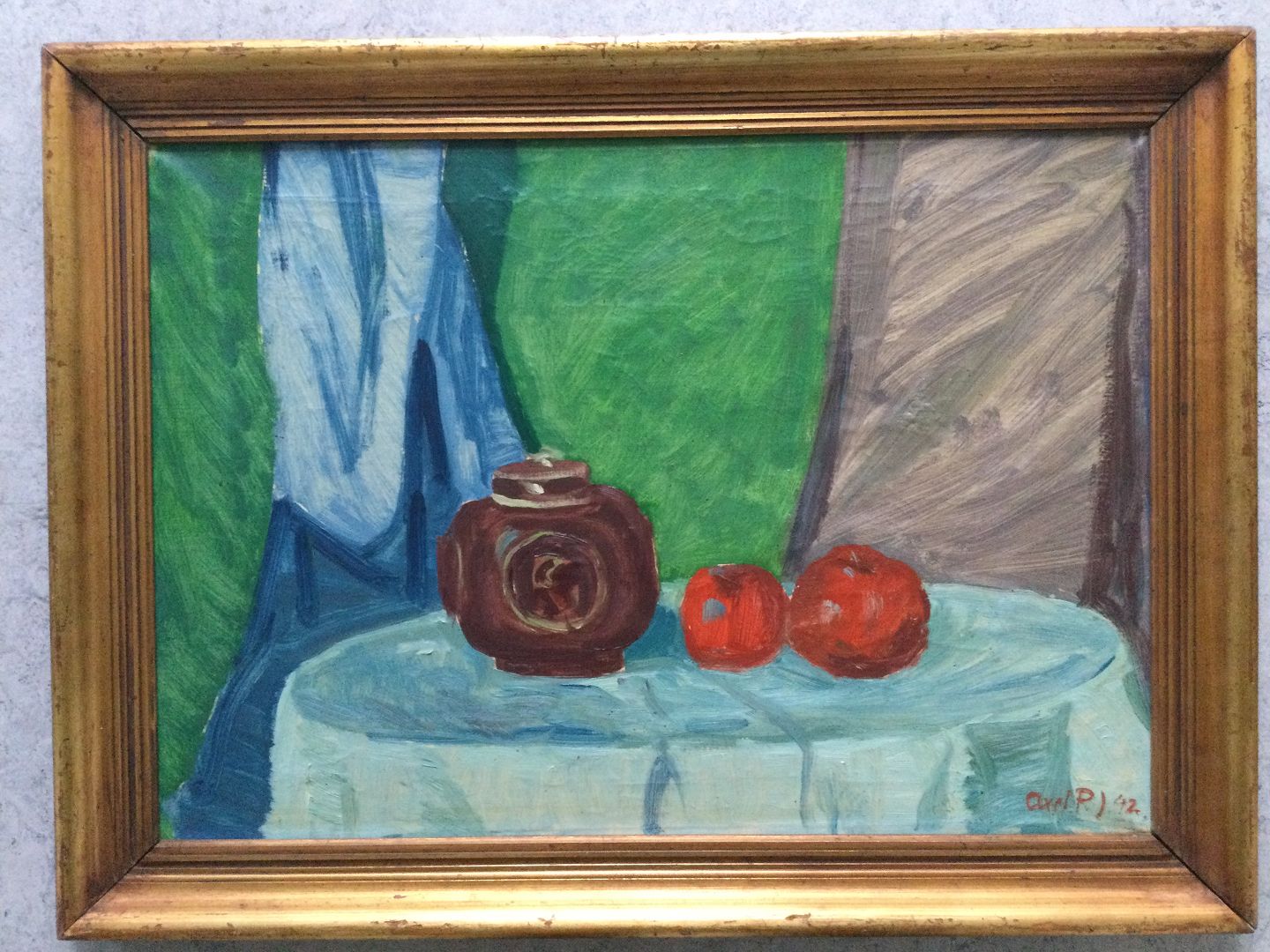 Maleri af Axel P. Jensen - Opstilling på bord med Jais Nielsen krukke og frugt 1942.