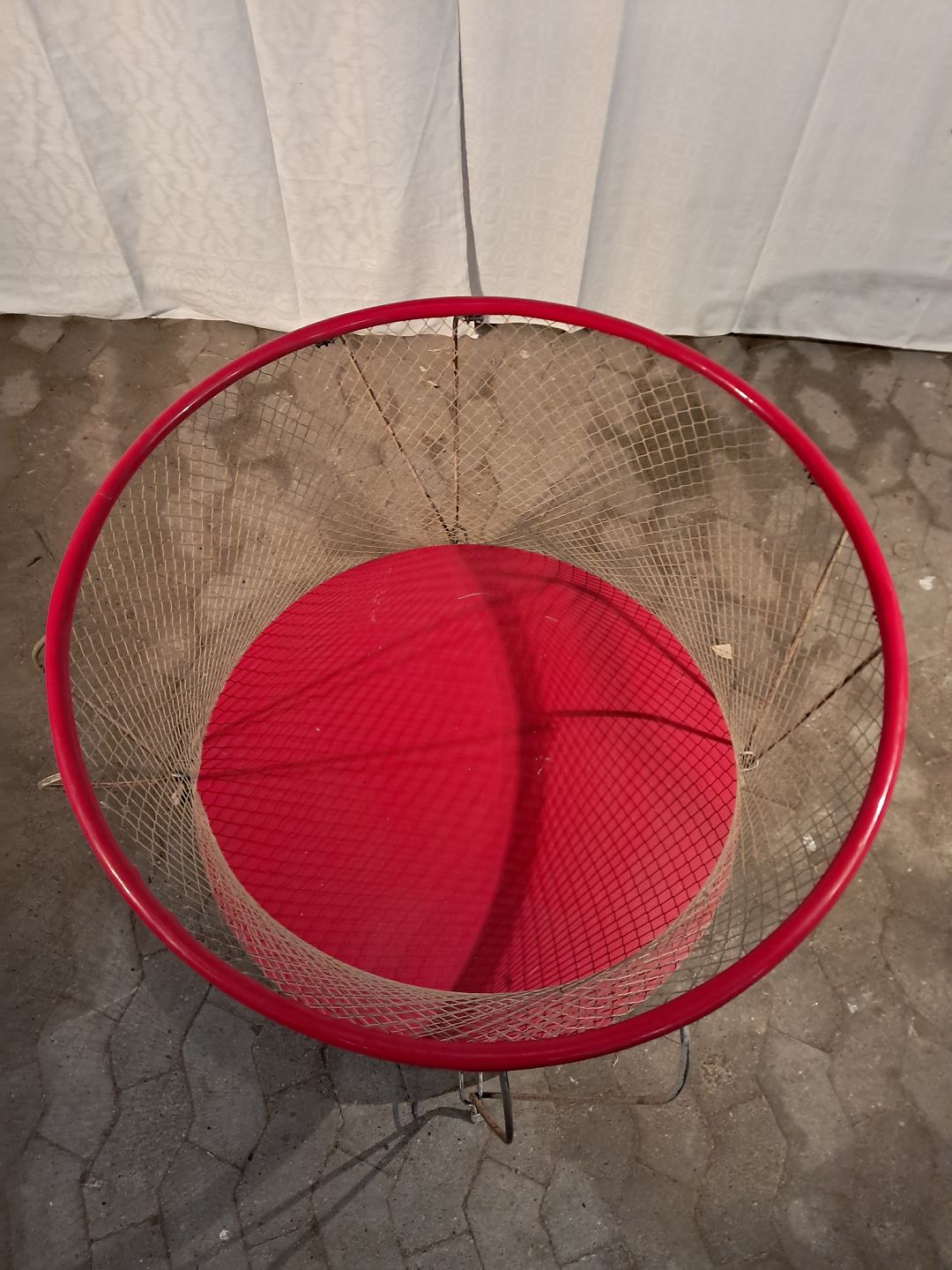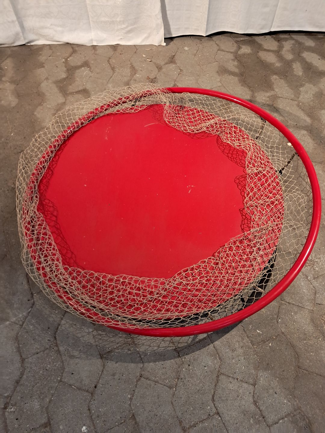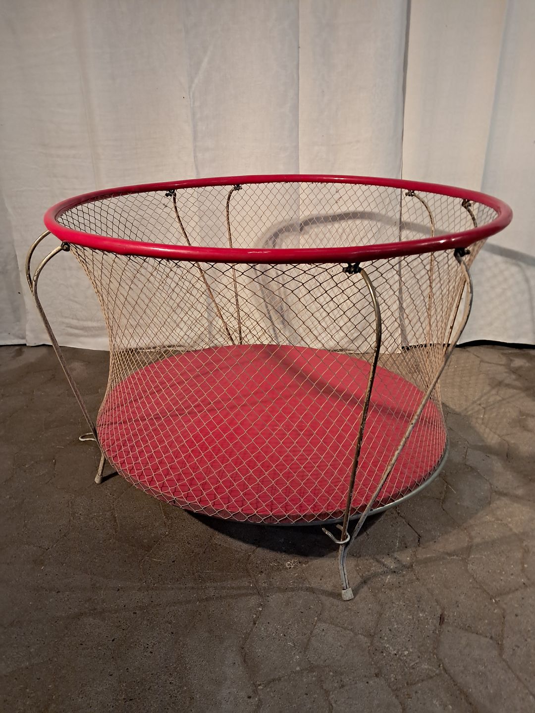 Kravlegård i metal med rød plastik og fiskenet, fra 1960erne.