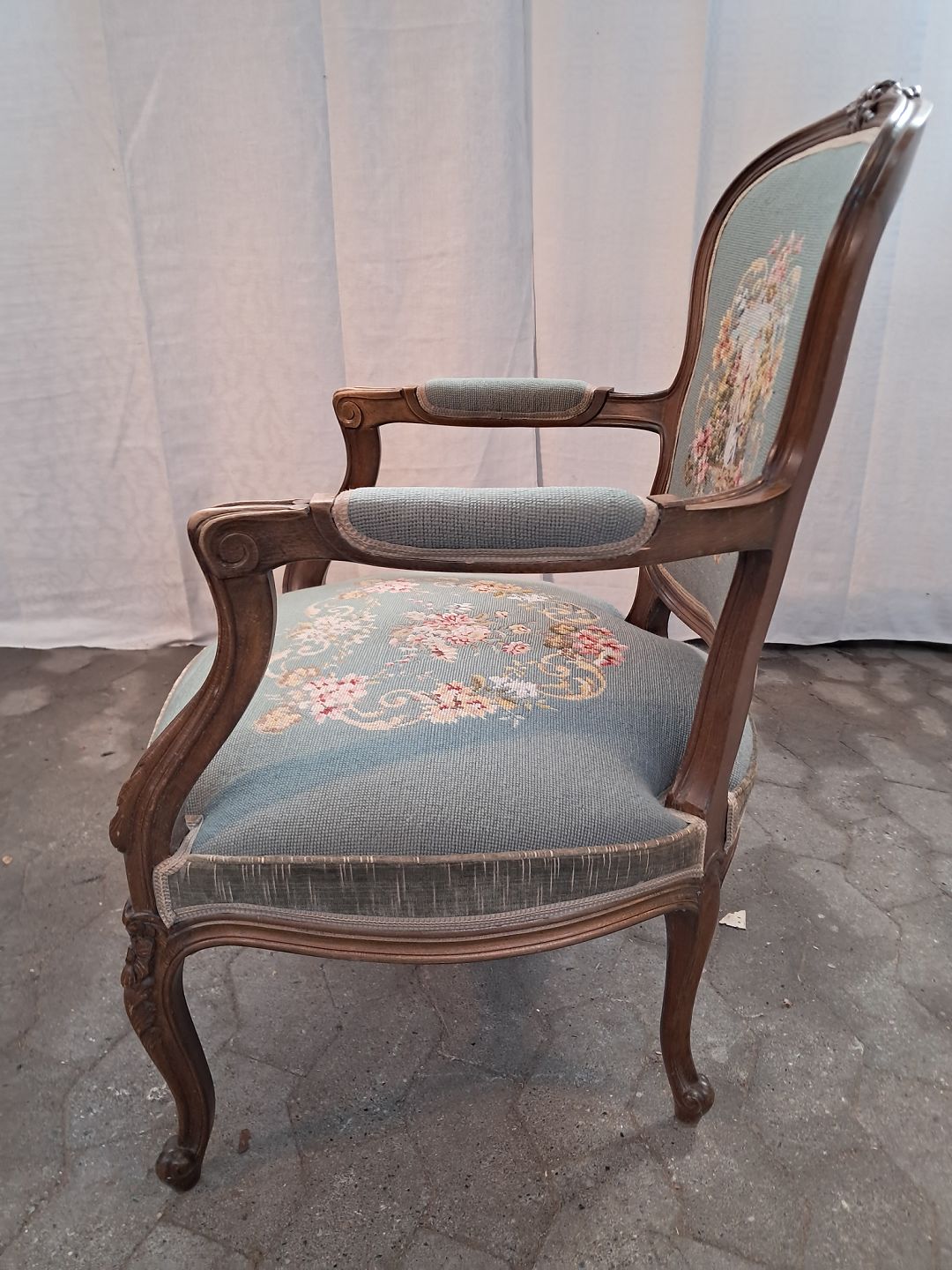 Rokokostol i massivt bøgetræ med broderet sæde, fra 1950erne.