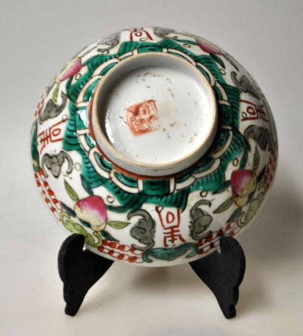 Kinesisk porcelæns skål på fod, 19. årh. Polykrom dekoreret med tebn, ferskner og flagermus. Stemplet. H.: 6,8 cm. Dia.: 16 cm.