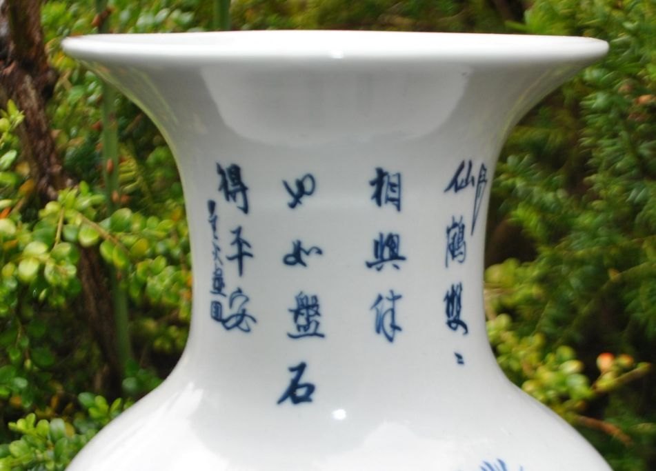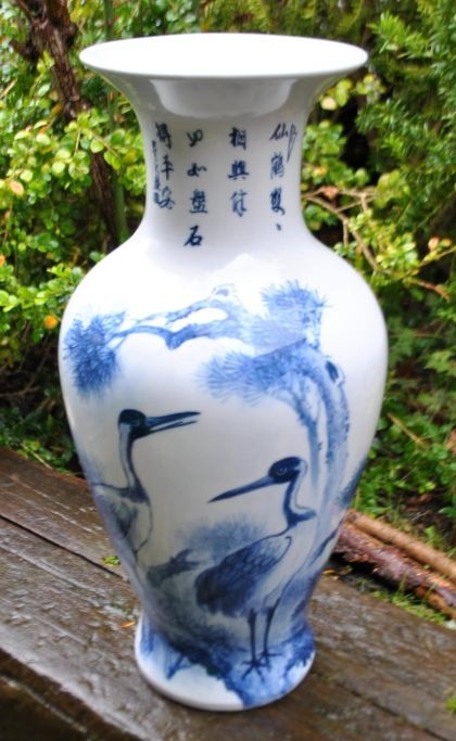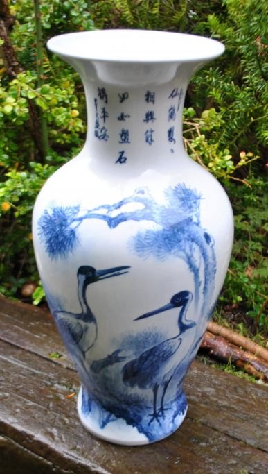 Ming village blå/hvid porcelæns gulvvase, 20. årh. Singapore. Håndmalede dekorationer af to traner. Med tekst. Signeret. H.: 48 cm.